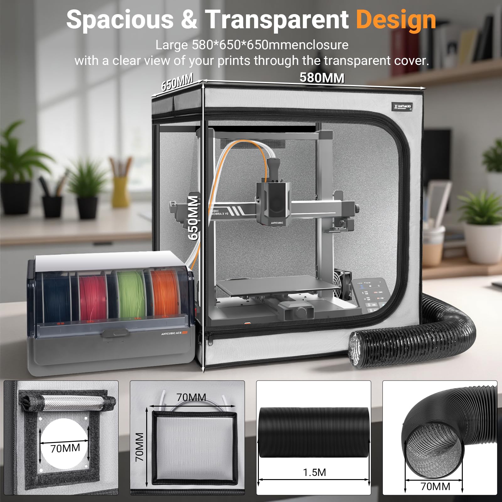 One of the standout features of this enclosure is its perfect fit for the Anycubic Kobra 3/3 V2 Combo. Measuring 590660650mm, it provides ample space while ensuring that your printer is well-protected. The integrated ventilation kit is particularly noteworthy. It efficiently extracts smoke and dust produced during printing, which is crucial for maintaining a clean workspace and ensuring safe operation.