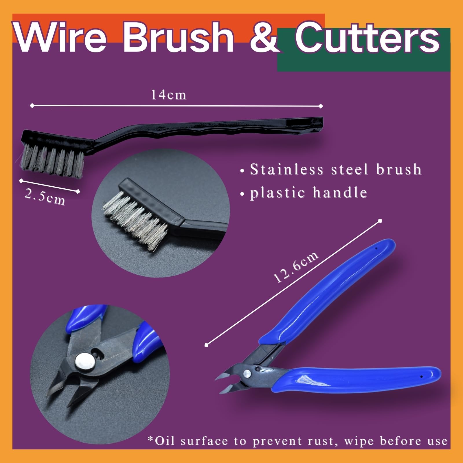 The kit includes side pliers, a putty knife, 10 cleaning needles in various sizes, wire brushes, tweezers, and a carrying case.