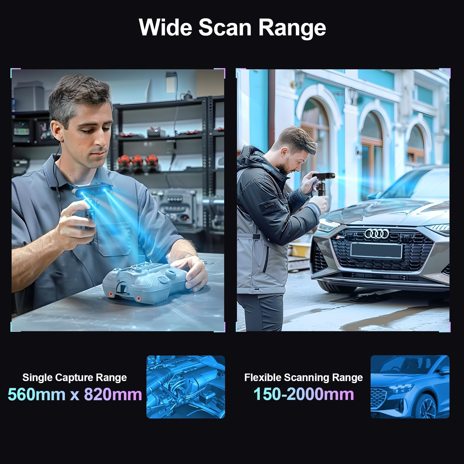 - Flexible scanning range from 150mm to 2000mm, with a single capture range up to 560 × 820mm.