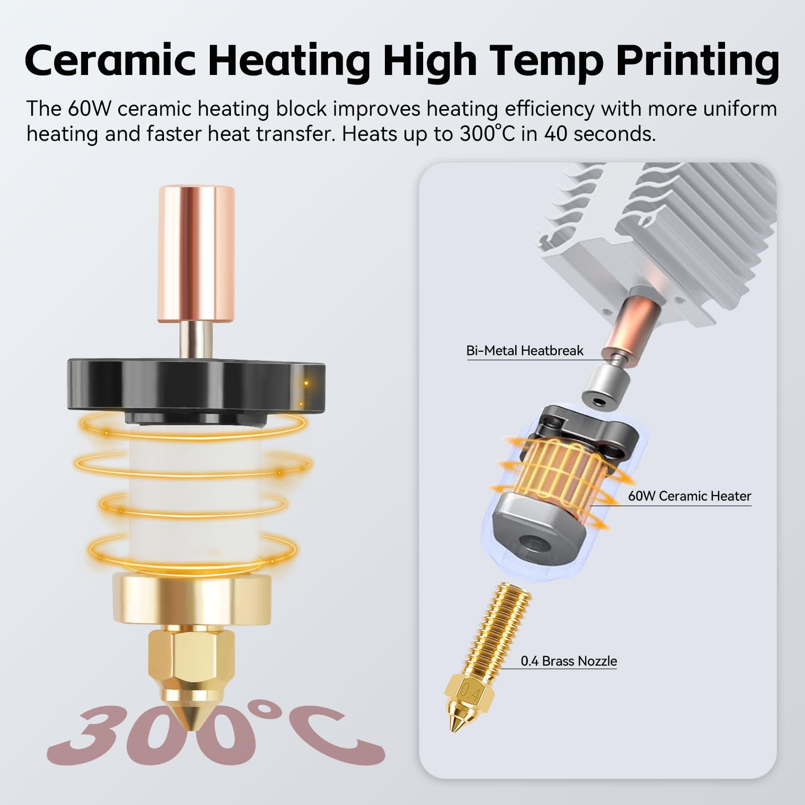 Ceramic Heating Block: The 60W ceramic heating block allows for rapid heat-up times, reaching 300℃ in just 40 seconds. This feature is particularly beneficial for users who work with high-temperature materials like ABS and PETG, ensuring they achieve optimal melting and flow.