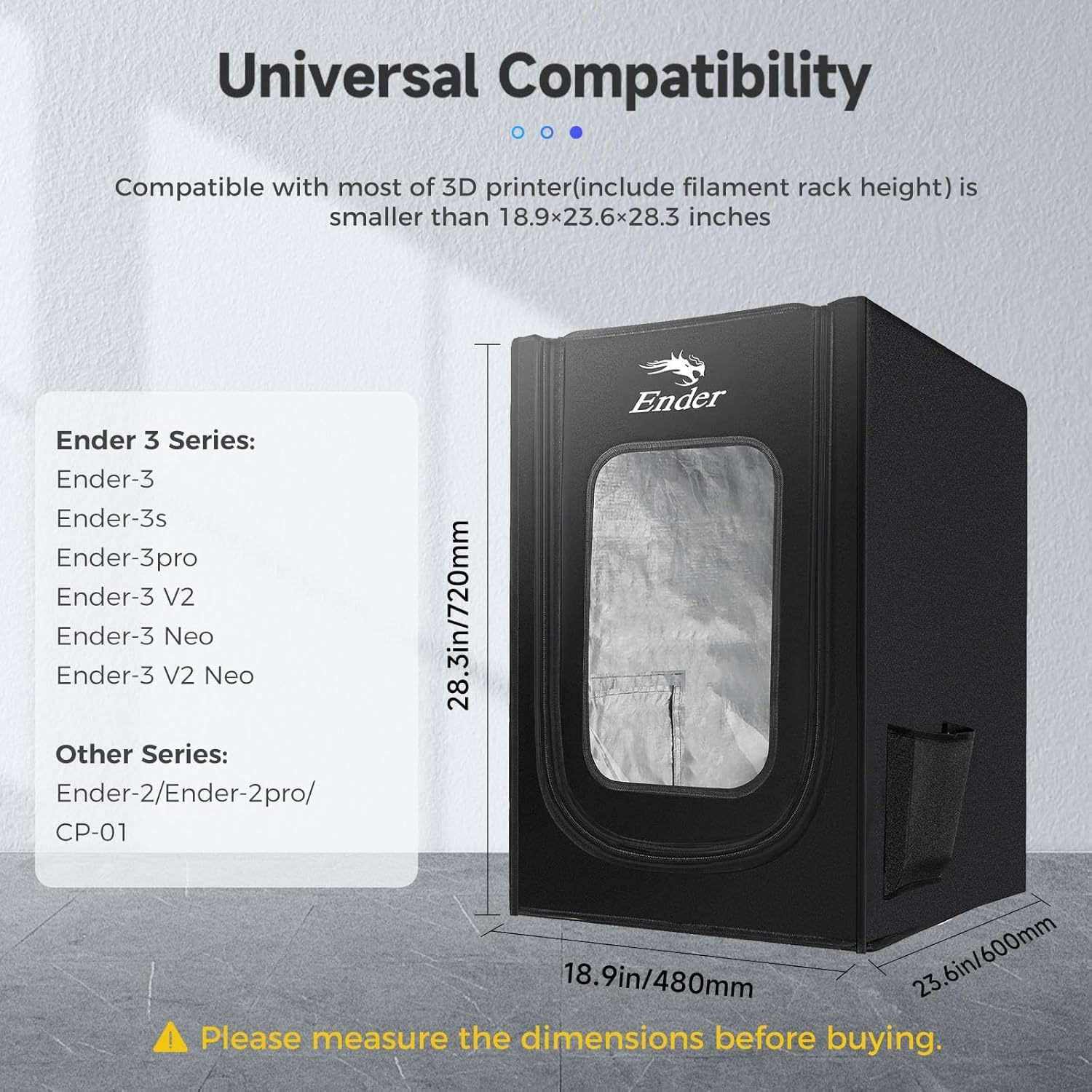 Upon unboxing the Creality enclosure, it's clear that the build quality is solid. The dimensions of 18.9 23.6 28.3 inches (480 600 720 mm) make it a spacious option for various FDM 3D printers, including the Ender 3, 3 Pro, 3 V2, and newer models like the 3 V3 SE. The design prioritizes functionality, with a sleek appearance that fits well in any workshop or home environment.