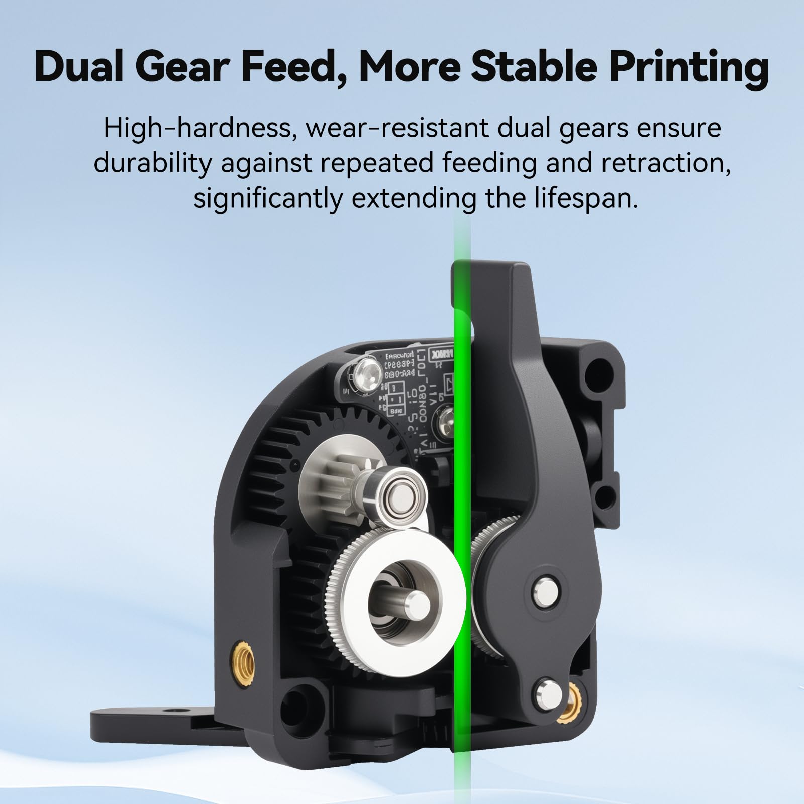Dual Gear Feeding: The high-hardness, wear-resistant dual gears are designed for durability and ensure smooth feeding even with abrasive filaments, which many users have praised in their reviews.