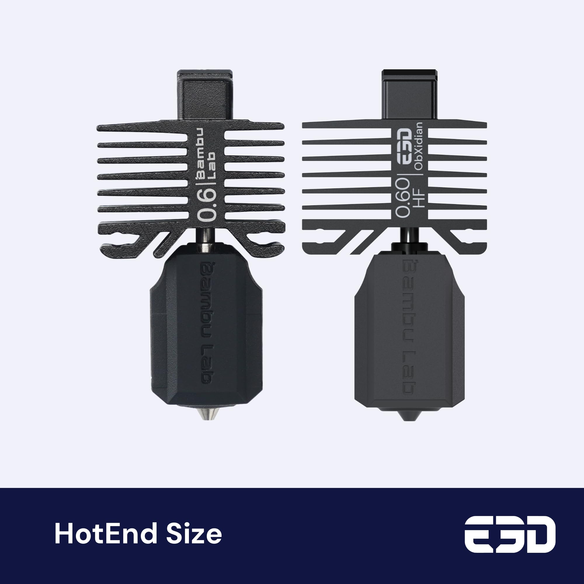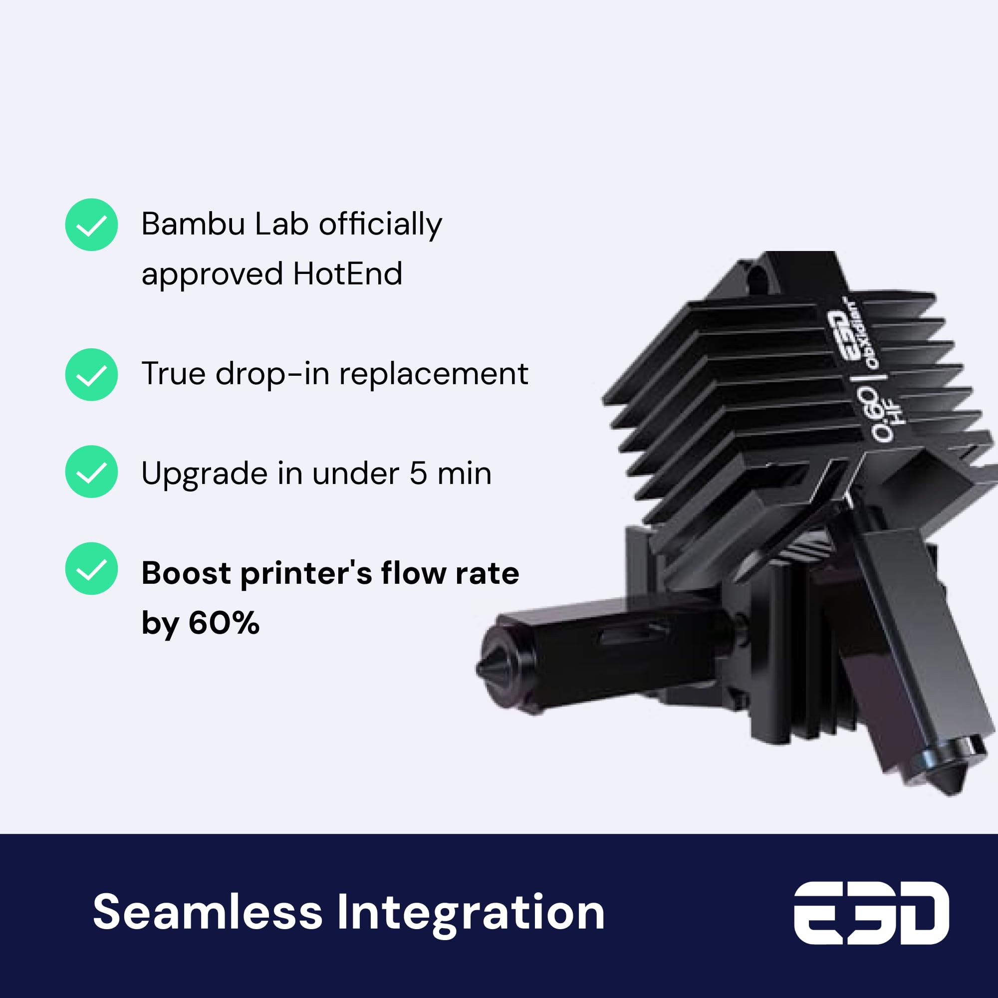 The E3D High Flow ObXidian™ Bambu Lab X1 Carbon (0.6mm) Complete HotEnd, priced at £102.00, offers a significant 60% increase in flow rate, making it a game-changer for high-speed printing, particularly with fiber-filled filaments. As an official collaboration between E3D and Bambu Lab, this HotEnd is specifically designed for Bambu Lab's P1 series printers, which are known for their speed but can benefit from improved performance.