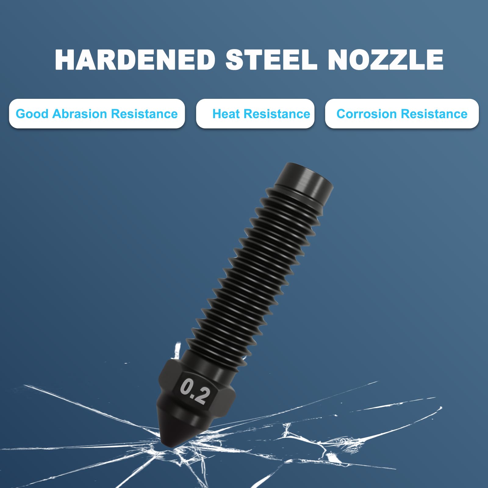 The nozzles are made from hardened tungsten steel, providing exceptional durability and high-temperature resistance for various printing tasks.