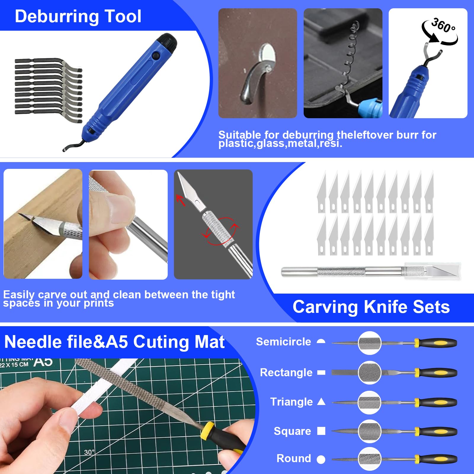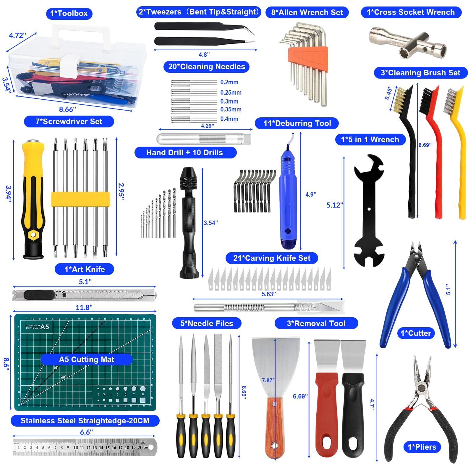 The kit includes a toolbox, deburring tools, cleaning brushes, screwdrivers, wrenches, and a cutting mat, making it a comprehensive solution for various tasks.