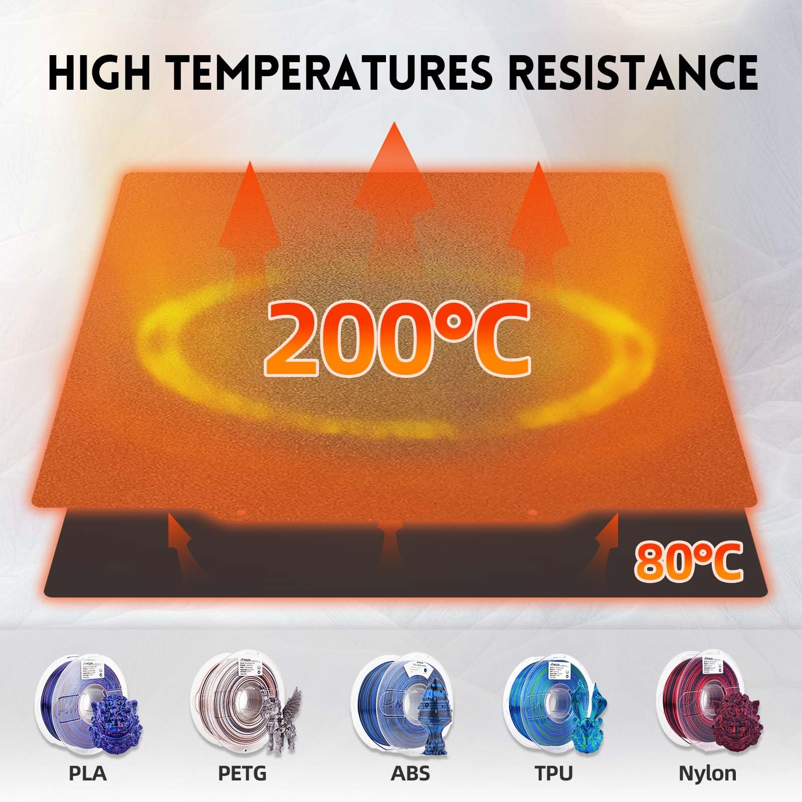 The PEI sheet works well with PLA, ABS, PETG, TPU, and Nylon, making it versatile for most 3D printing projects.
