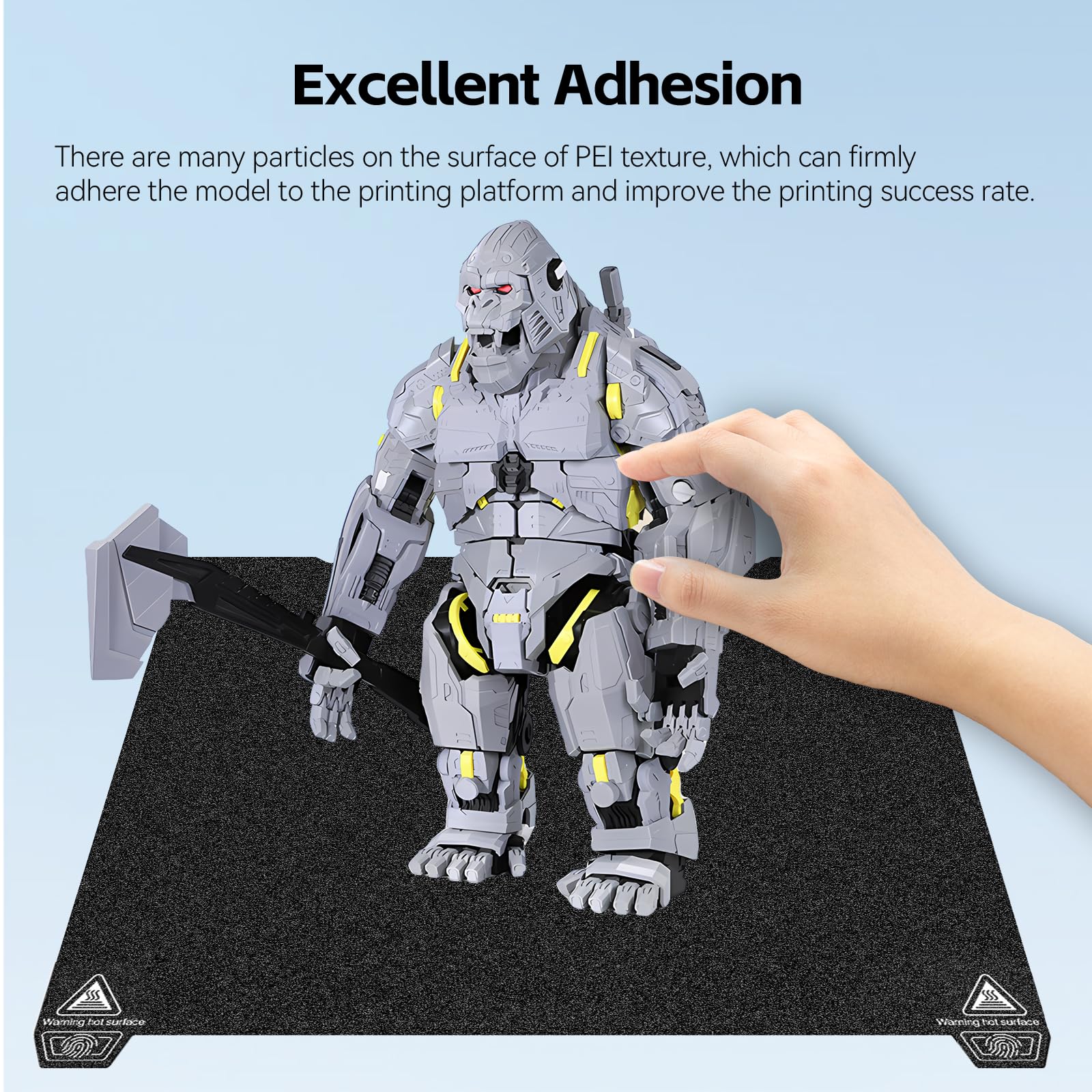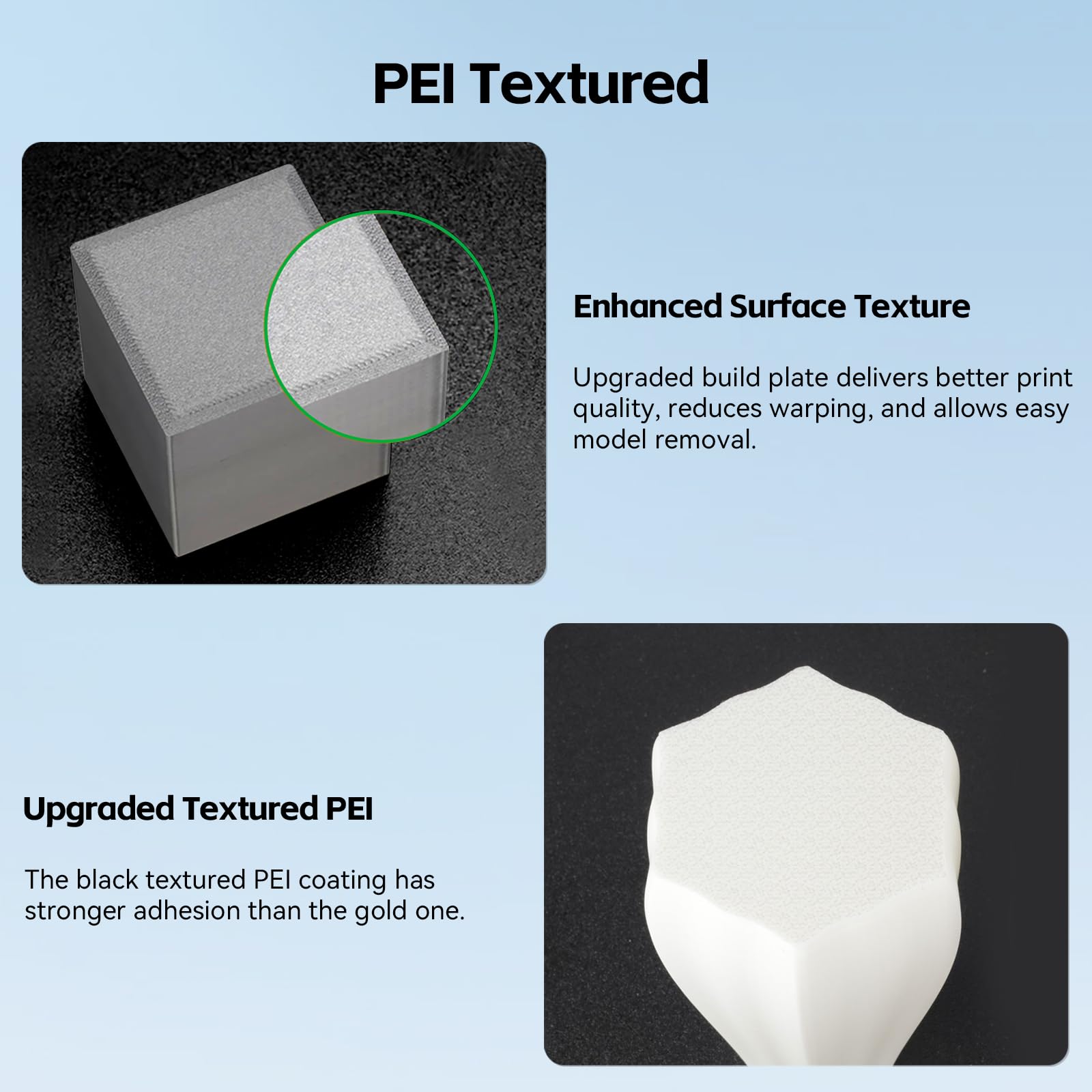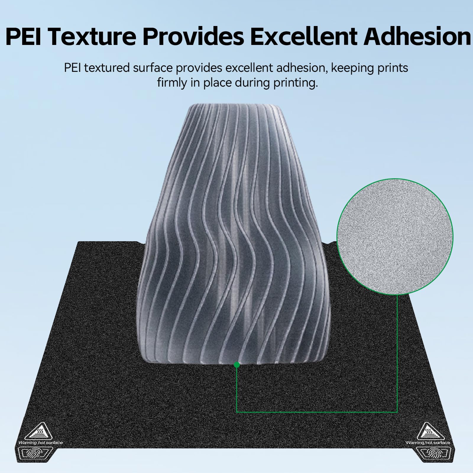 - Double-sided textured PEI coating enhances adhesion for various materials.