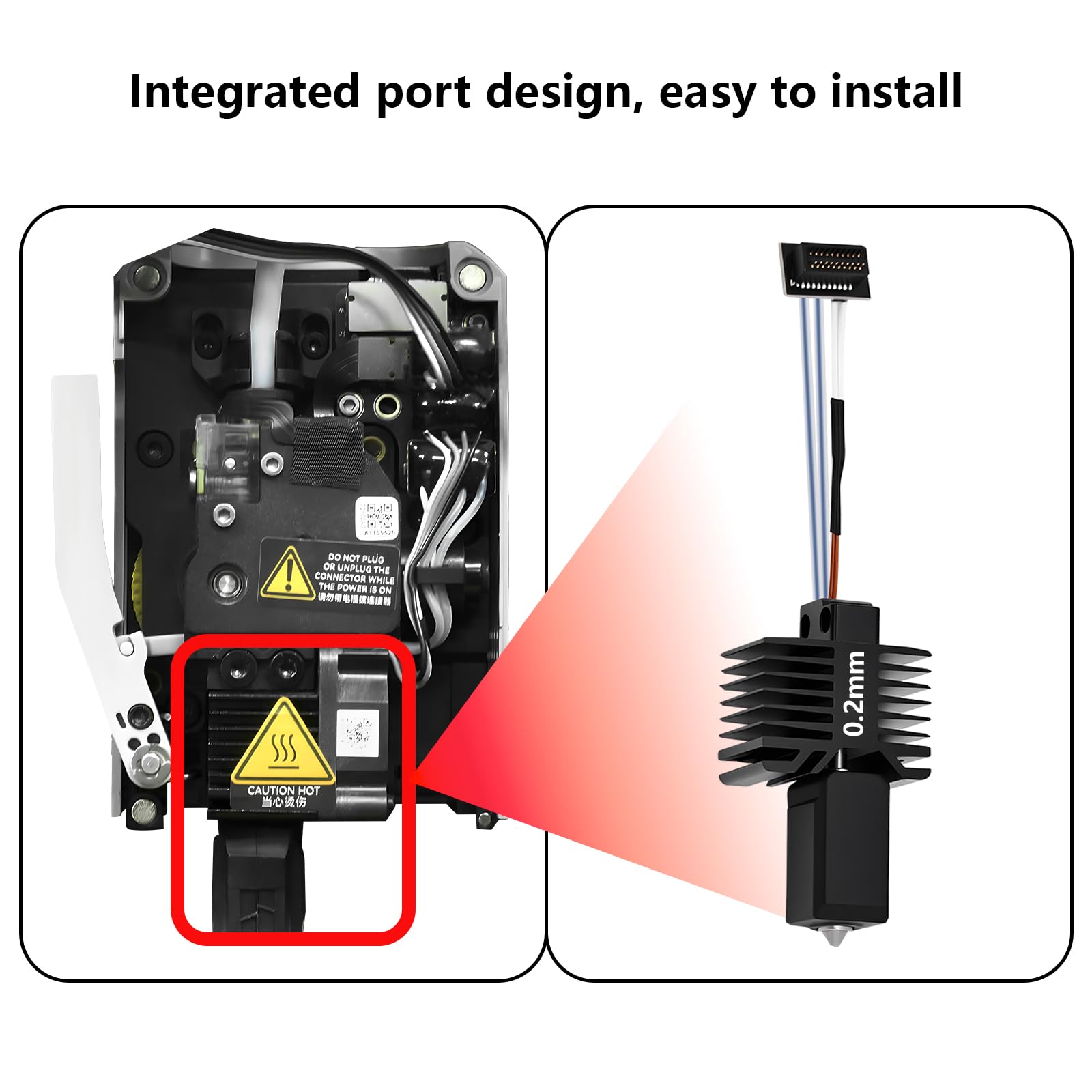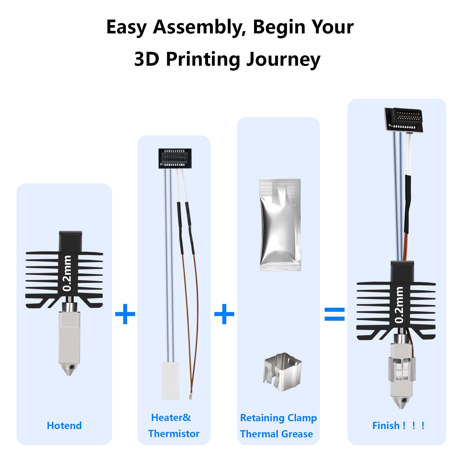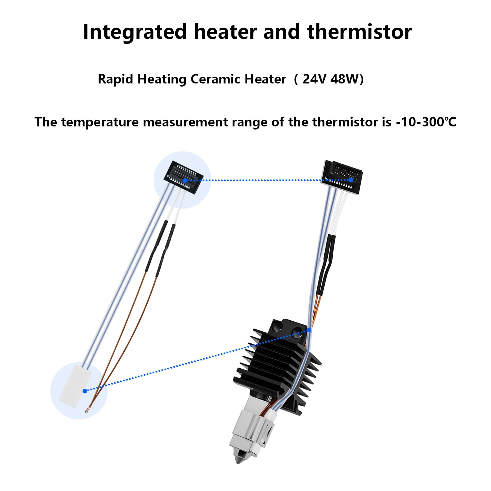 The hotend comes equipped with a 0.2mm hardened steel nozzle, which is resistant to abrasion and clogging, allowing for a smoother printing experience with various materials like PLA, PETG, TPU, and ABS. The durable all-metal construction not only adds to its longevity but also helps maintain performance under high temperatures. One of the standout features is the rapid 24V, 48W ceramic heating element, which heats up quickly, providing better efficiency during prints. The premium thermistor ensures accurate temperature control, making it easier to achieve consistent results.