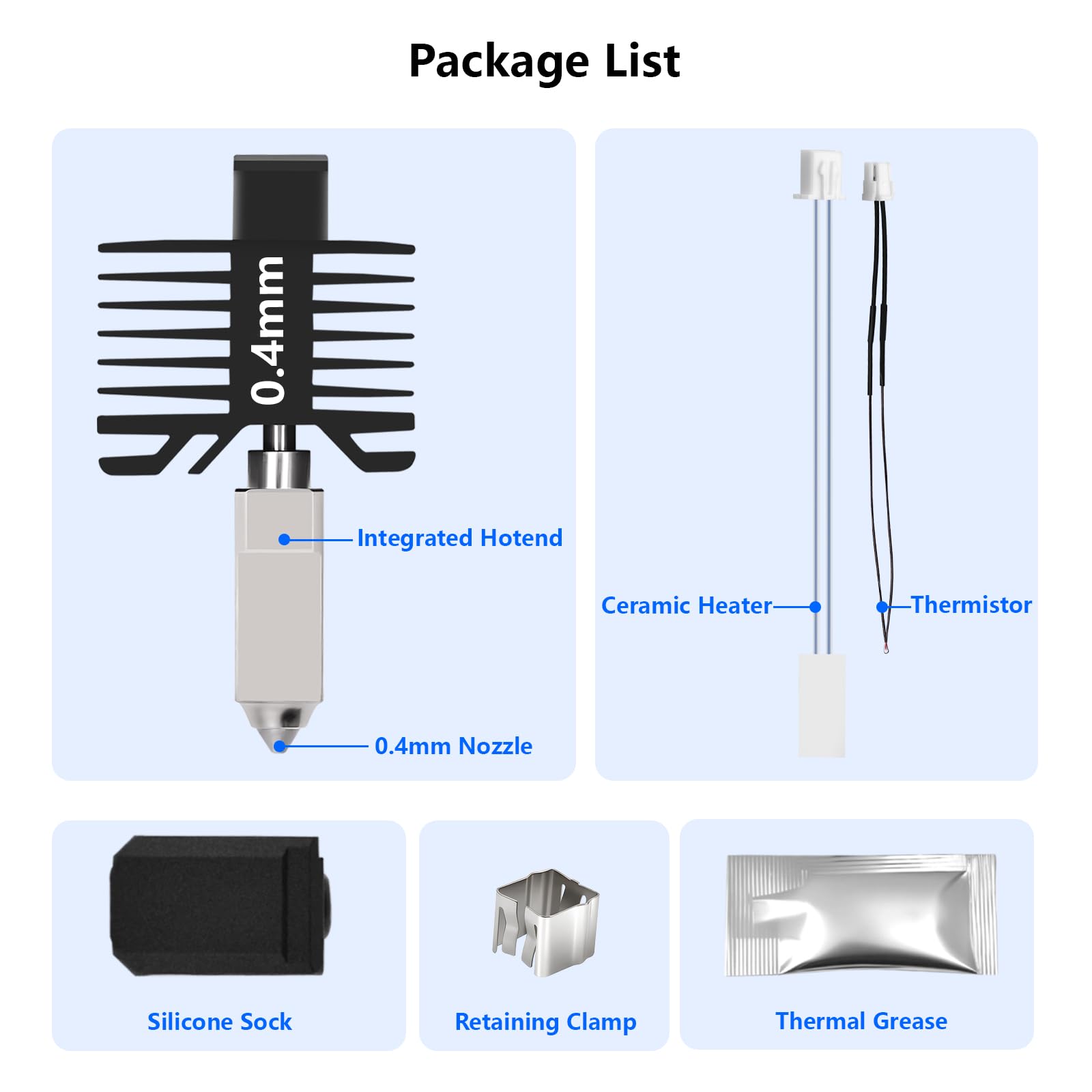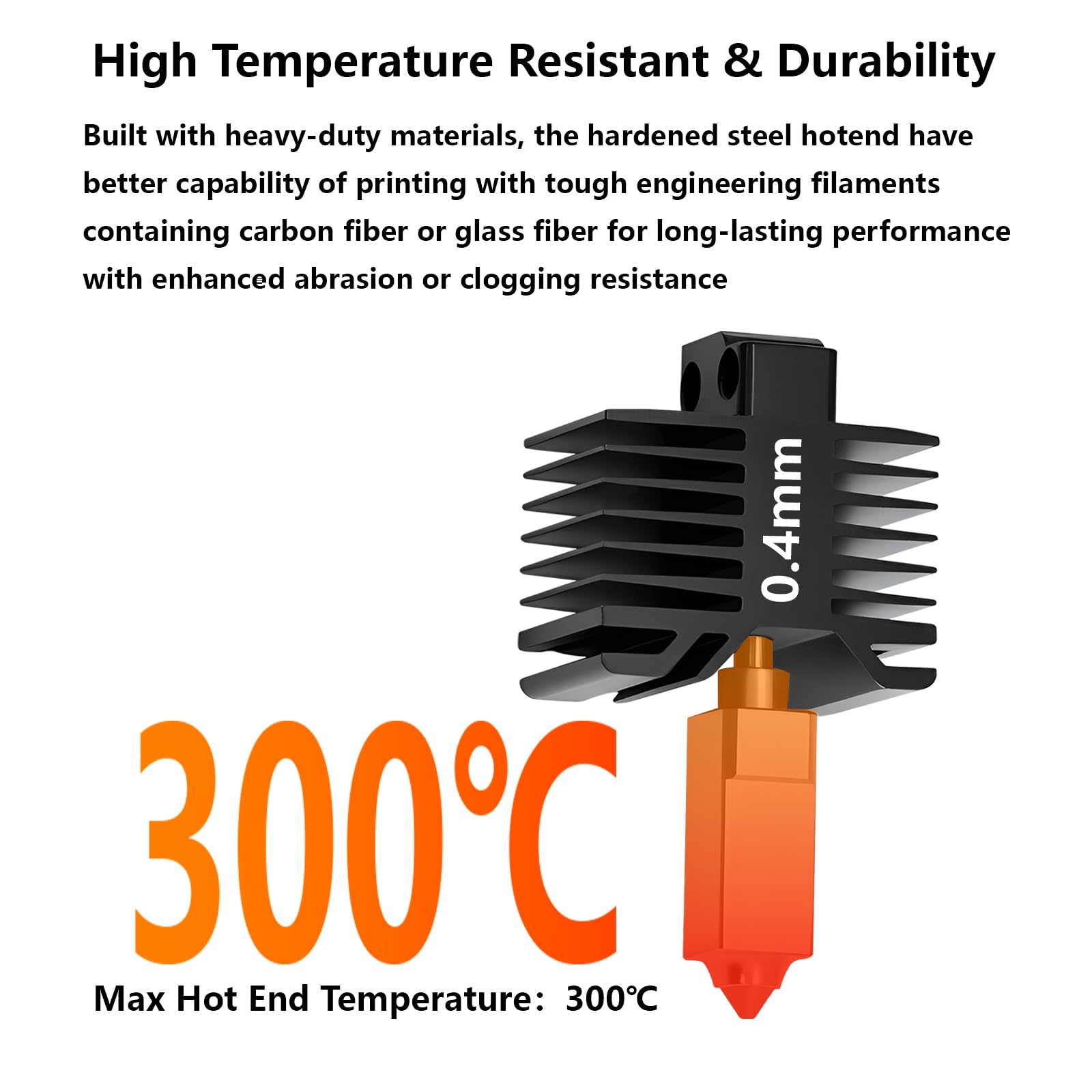 The hotend is compatible exclusively with Bambu Lab X1/X1C models and includes a 0.4mm hardened steel nozzle, which promises durability and resistance to abrasion. It's equipped with a rapid 24V/48W ceramic heating element, allowing for quick temperature increases, essential for maintaining print quality. The high-temperature thermistor ensures stable and accurate temperature readings, crucial for preventing issues like under-extrusion or overheating.