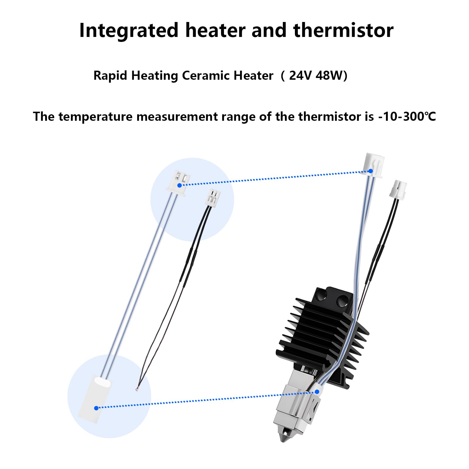 The hotend heats up rapidly due to its 24V/48W ceramic heating element, allowing for efficient printing with minimal wait times.