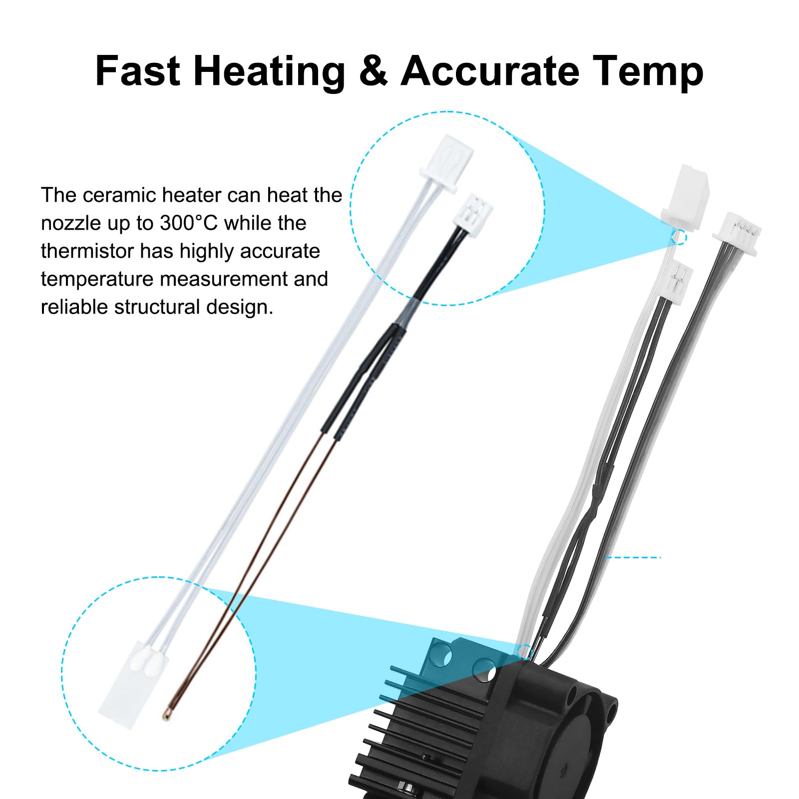 One standout feature is the integrated heater and thermistor module, which allows for efficient temperature management. The ceramic heater can achieve temperatures of up to 300℃, essential for printing with high-performance materials. Moreover, the thermistor provides accurate temperature readings, crucial for maintaining print quality. The safety cooling fan is also a significant addition, featuring an auto-shutoff function that ensures safety during operation.