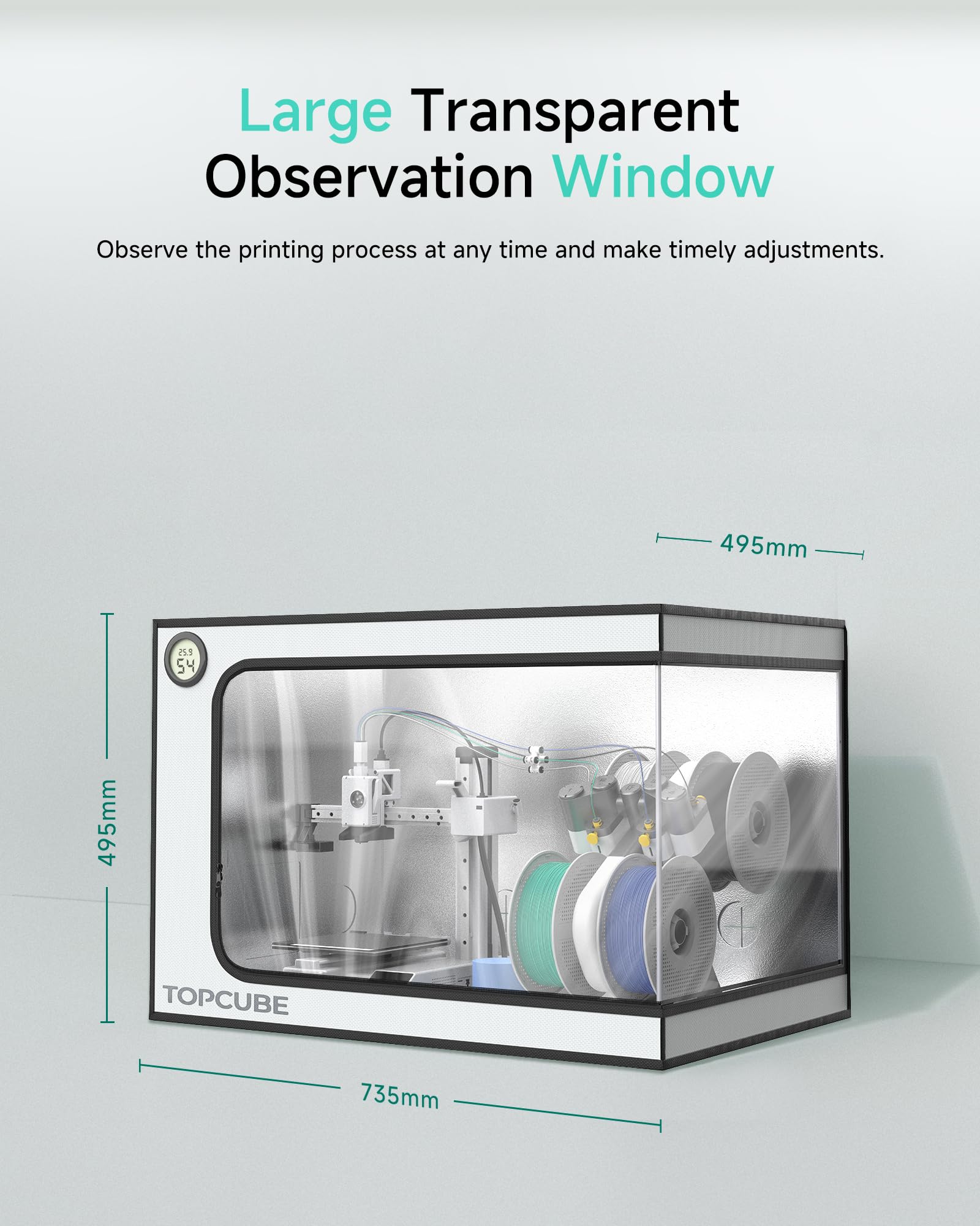 - Reduces print failures by stabilising temperature and minimising drafts.