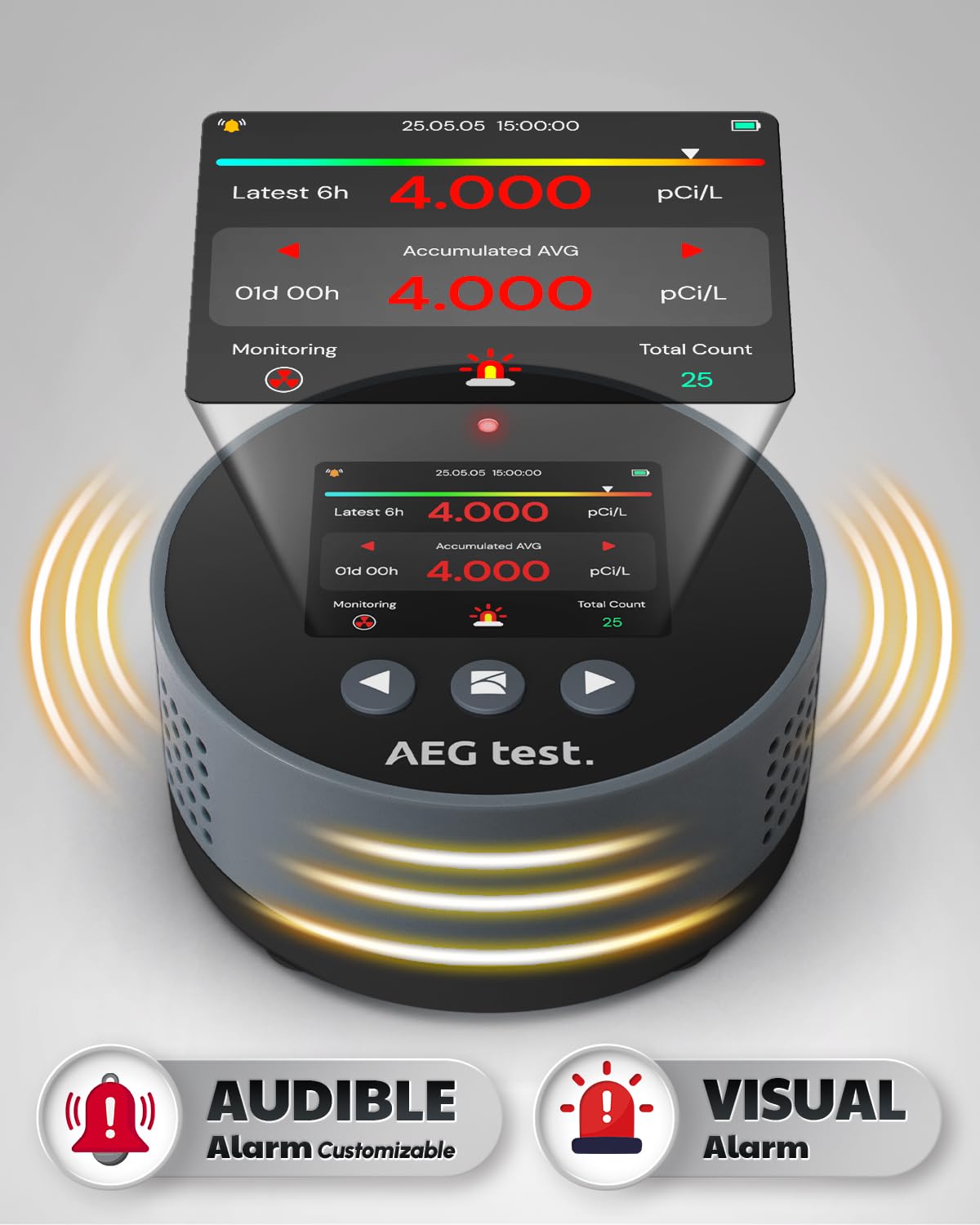- Audible and visual alarms plus colour-coded bars make elevated radon levels easy to spot quickly.