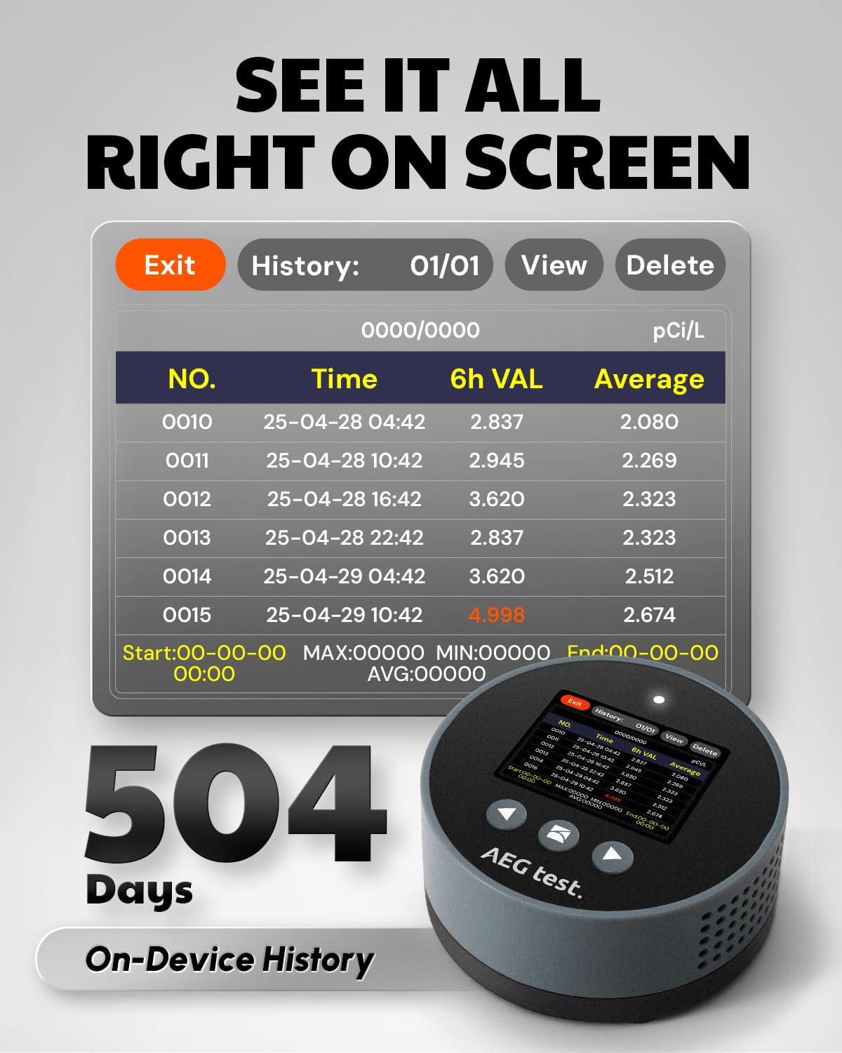 It shows short-term readings across 6, 24, 48, and 96 hours, then stores long-term data for up to 504 days. That makes it useful for spotting trends rather than relying on a single momentary reading, which is important because radon levels can change with ventilation, weather, and room use.