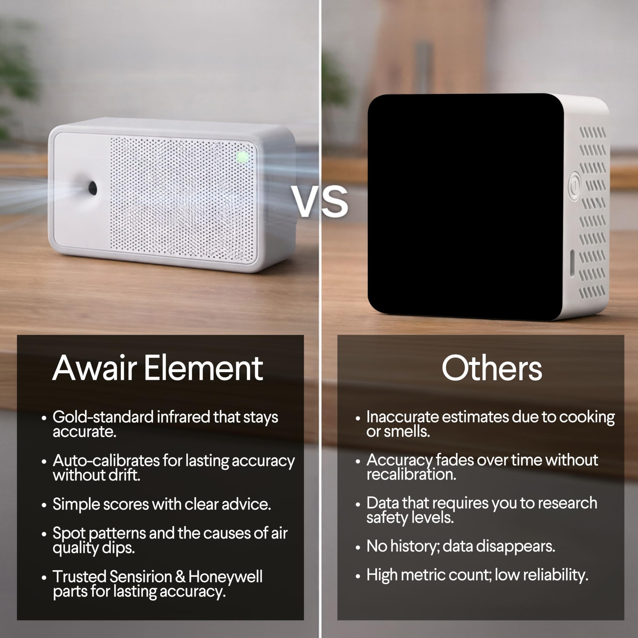 When comparing the Awair Element to competitors, the SAF Aranet4 offers a slightly higher rating but lacks comprehensive VOC monitoring, which is vital for those concerned about indoor air quality. The SwitchBot CO2 Detector is significantly cheaper at £47.59 but lacks the advanced features and real-time tracking that the Awair provides. The Airthings Wave Plus, while similar in price, does not feature the same level of app integration and real-time alerts.