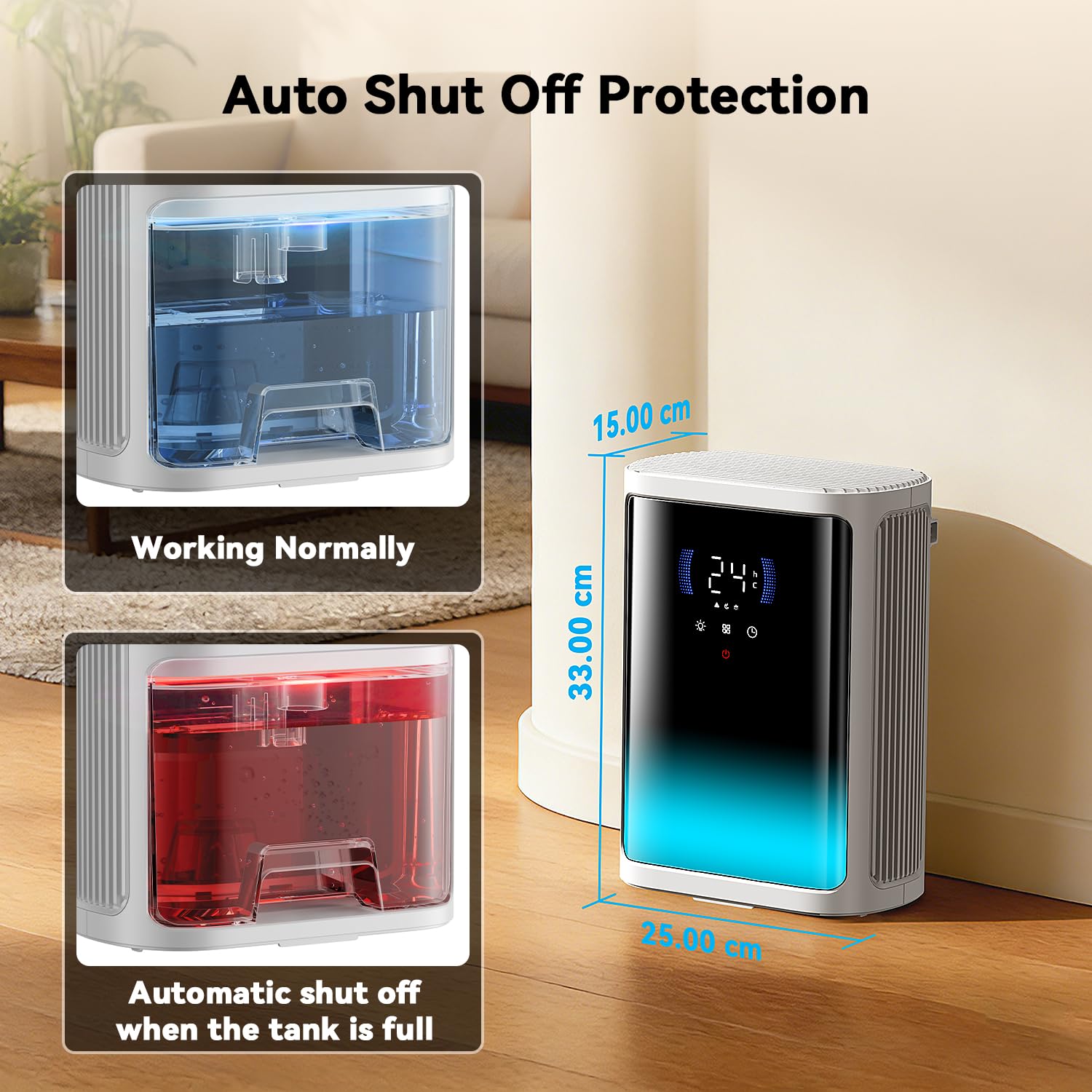 The 12-hour timer with three settings (6, 8, or 12 hours) allows for precise control and energy savings, preventing unnecessary operation when it’s not needed. The automatic shut-off feature ensures safety, activating when the water tank is full, which is a crucial aspect for those leaving the unit unattended.