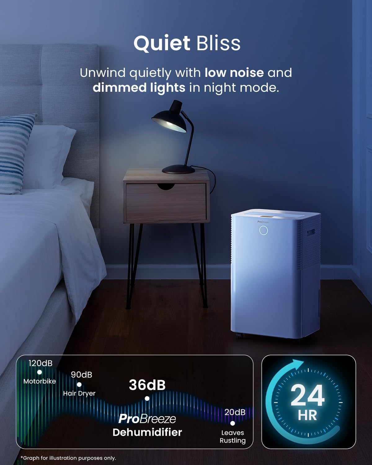 - Ultra-quiet operation at less than 38dB, ideal for bedrooms.