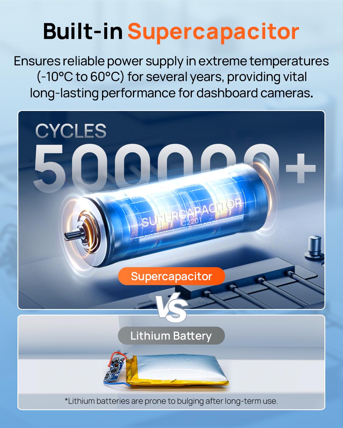 In terms of performance, the 70mai A800SE excels with 24/7 parking surveillance when connected to a hardwire kit. The built-in G-sensor detects sudden movements, making it an excellent choice for parked cars in busy urban areas. Loop recording ensures uninterrupted footage by overwriting the oldest files when storage is full. The included 128GB SD card supports ample storage, while the device can accommodate up to 512GB for those needing more space.