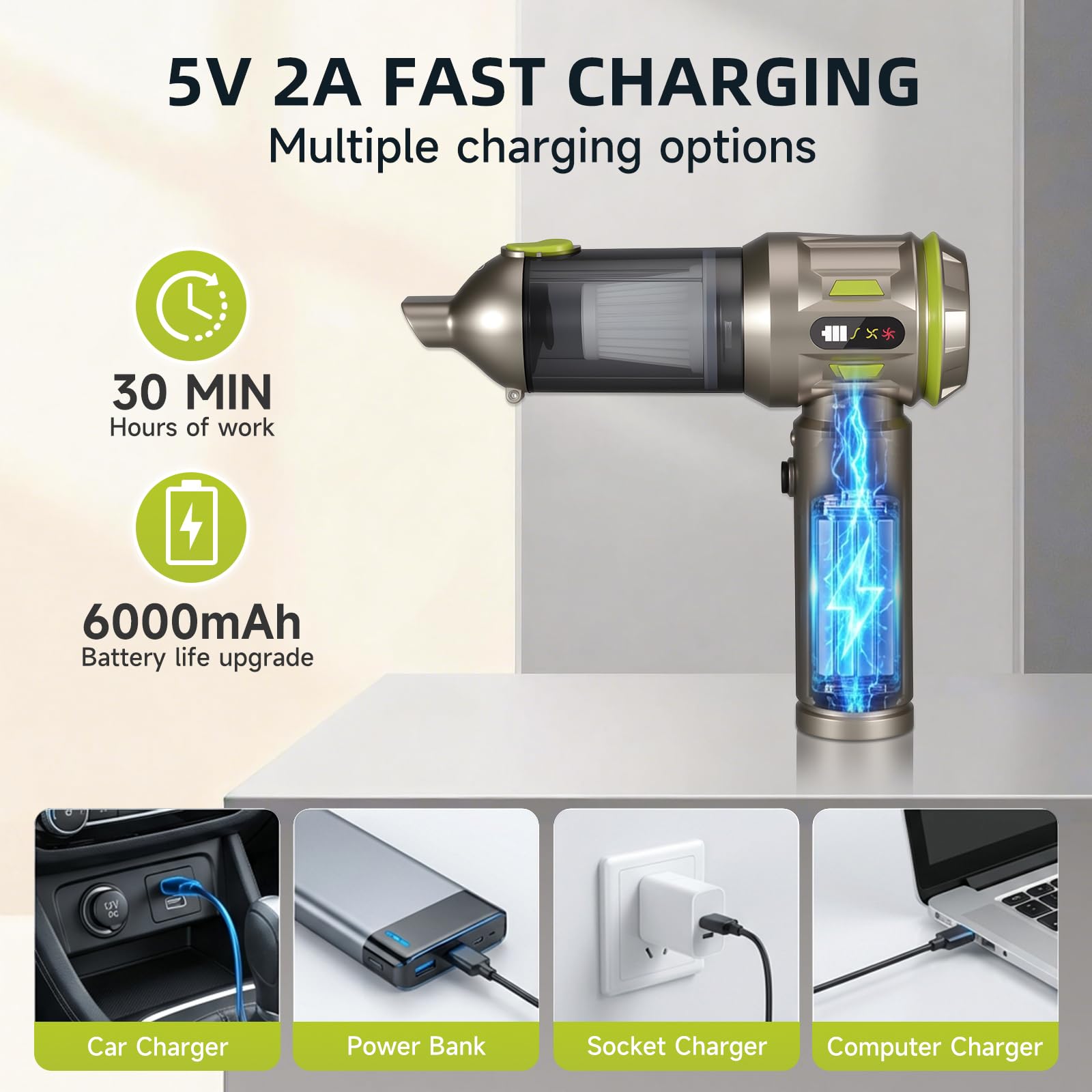 Upon unboxing the DEUKNICE vacuum, the first thing that stands out is its sleek silver design, which adds a touch of modernity. Weighing in as a lightweight device, it feels comfortable to hold and easy to manoeuvre. The inclusion of nine interchangeable nozzles is impressive, as it caters to a variety of cleaning needs — from vacuuming and blowing to inflating, making it a multi-functional tool.