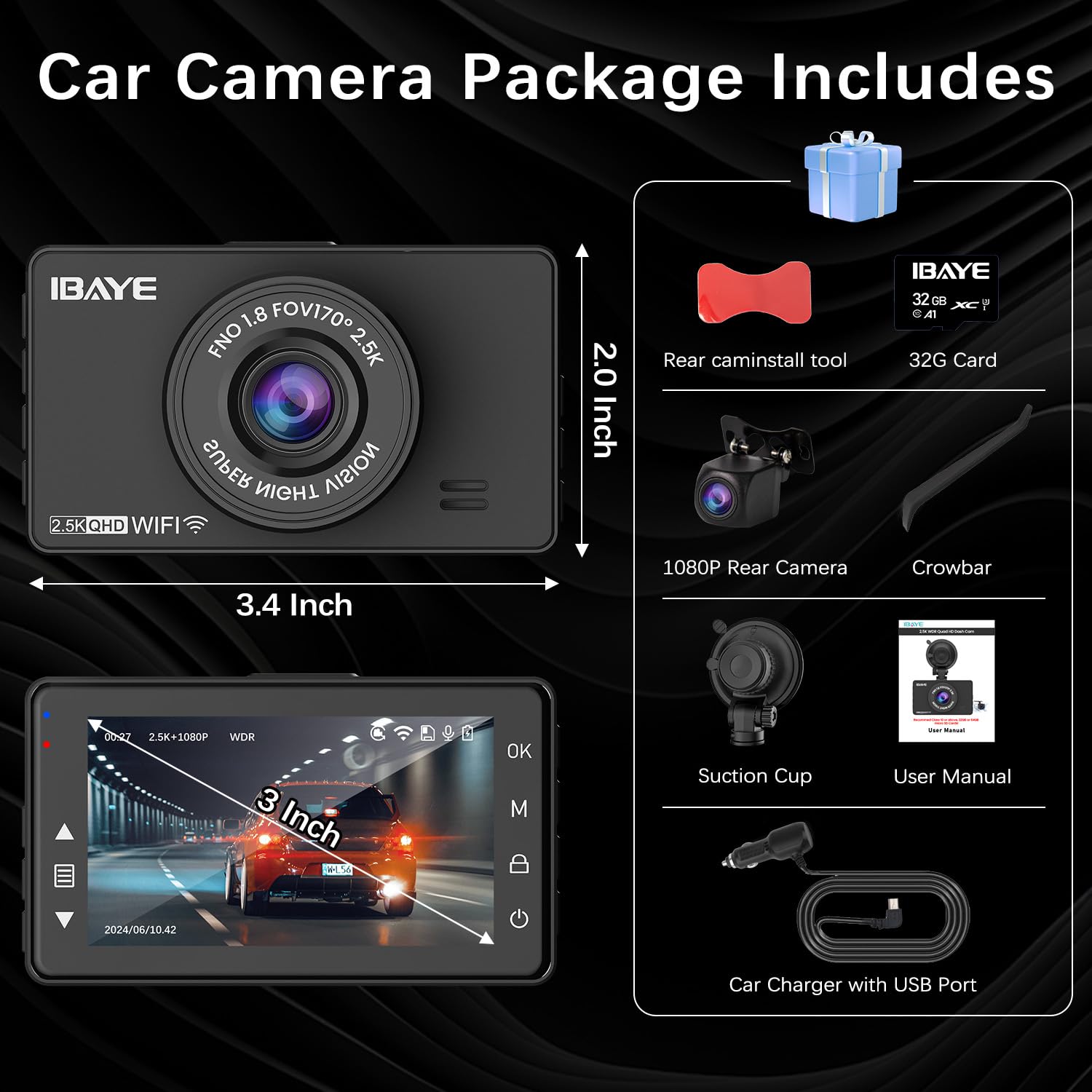 The headline spec is kind of wild for this price: 2.5K QHD front recording, 1080P rear recording, a 170° front field of view, WiFi/app control, super night vision, G-sensor, loop recording, and even a free 32GB SD card in the box.