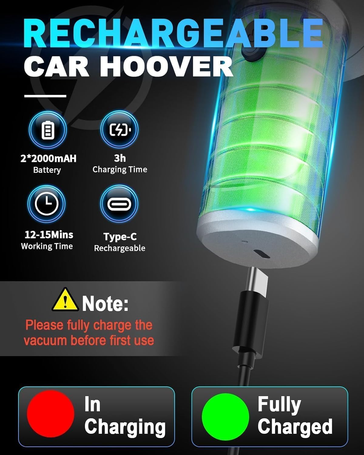Performance-wise, the vacuum is rechargeable via a Type-C port, taking only 2-3 hours to fully charge, which is convenient for users who need a quick turnaround. However, the battery life is not specified, which may leave some users wanting more information. The compact size makes it easy to store in car glove compartments or kitchen drawers, adding to its practicality.