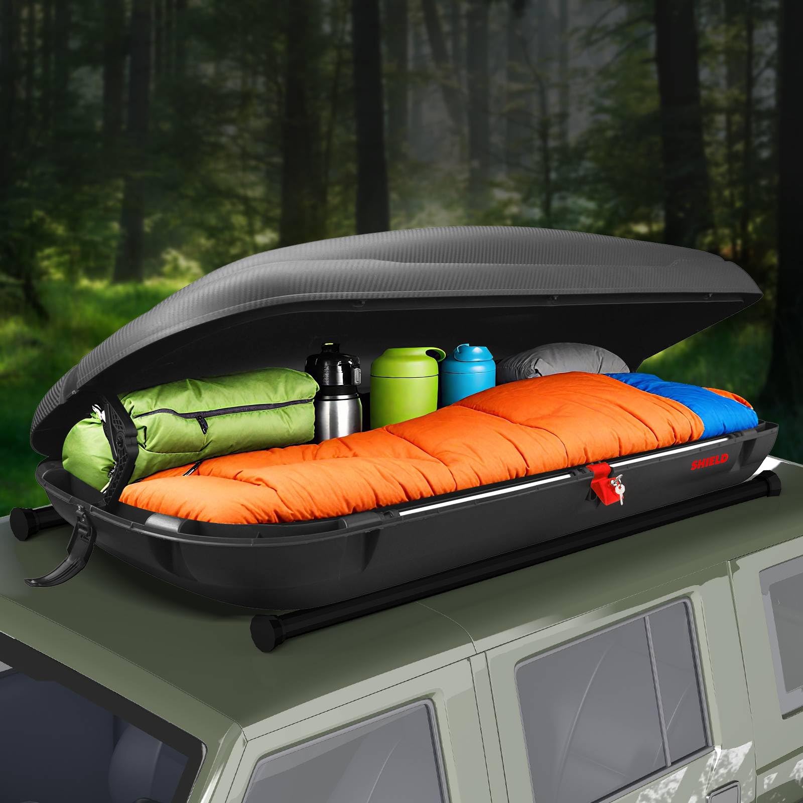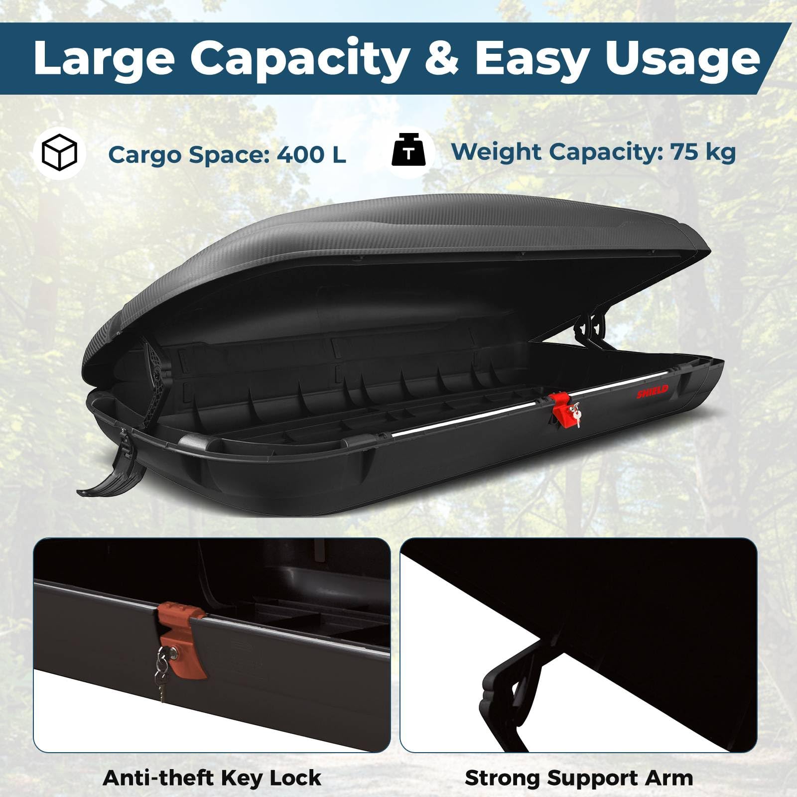 Spacious Storage: The TANGZON roof box provides 400L of storage space, ideal for carrying everything from tents to luggage. This ample capacity is particularly useful for family road trips or outdoor adventures where space is limited inside the vehicle.