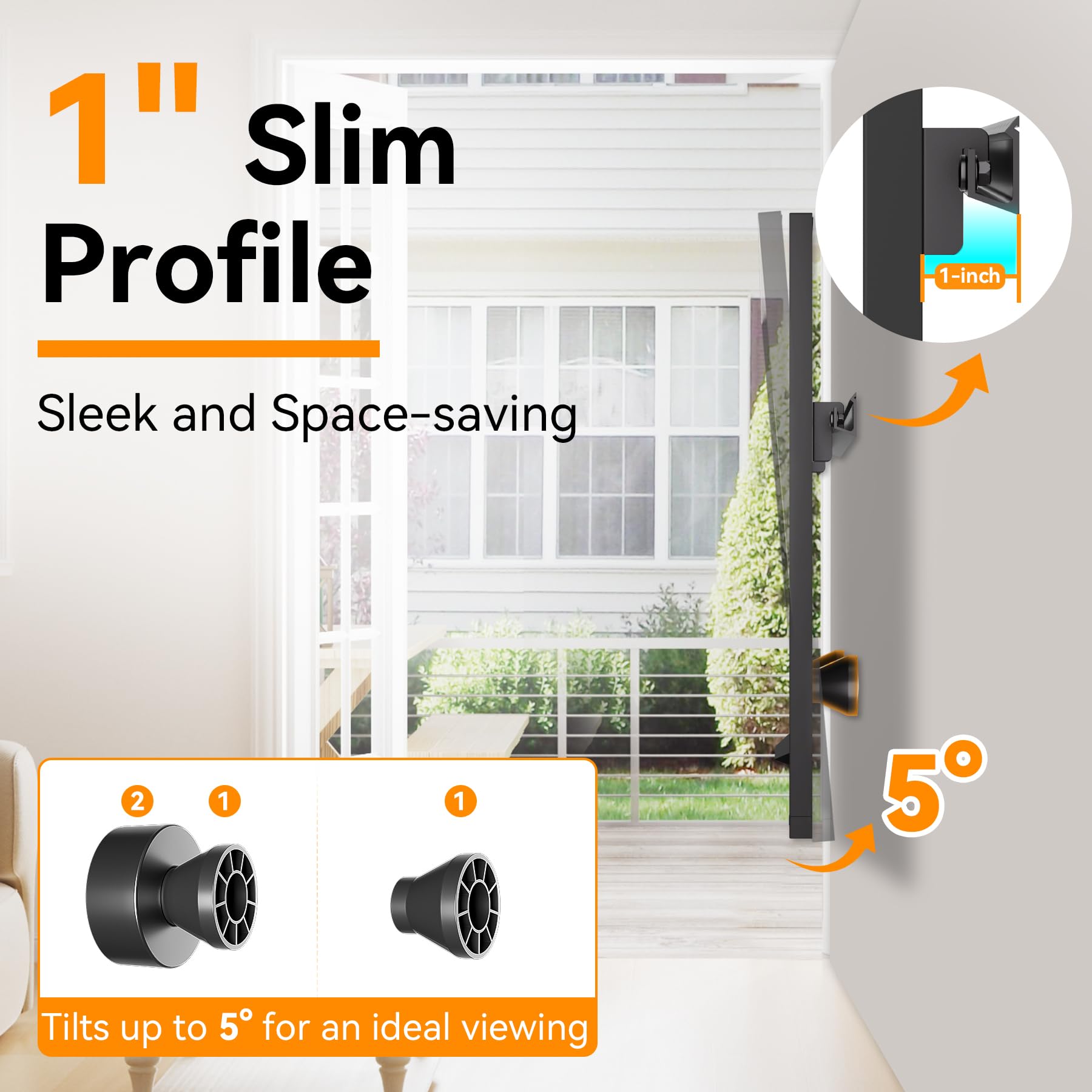 Upon unboxing, the Aetubree mount impresses with its sleek, ultra-slim design that sits just 1 inch from the wall. The black finish is visually appealing and blends well with most decor styles. The packaging includes all necessary installation hardware, making it a straightforward setup for most users.