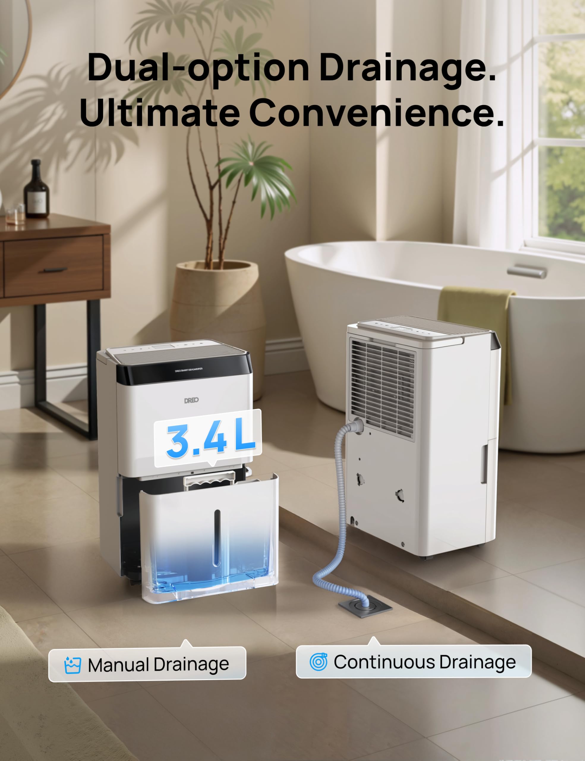 - The 3.4L tank may require frequent emptying in very damp conditions, especially without a continuous drain setup.