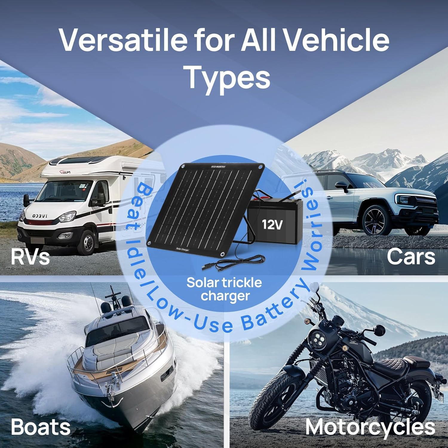 The ECO-WORTHY Upgrade 10W Solar Car Battery Trickle Charger & Maintainer is a suitable option for eco-conscious vehicle owners looking to maintain their batteries effectively. However, those seeking a more powerful solution for larger batteries may want to explore higher wattage options.