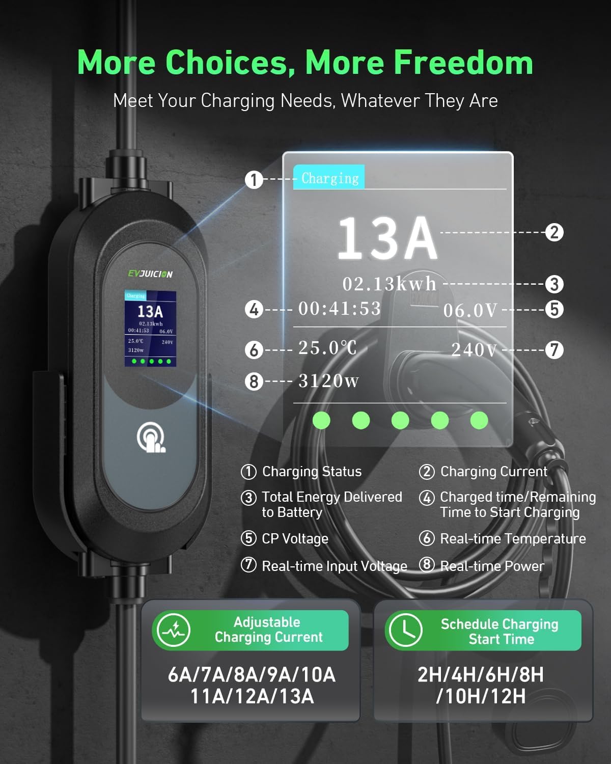 - Versatile Charging Options: Supports current settings from 6A to 13A, catering to different charging needs.