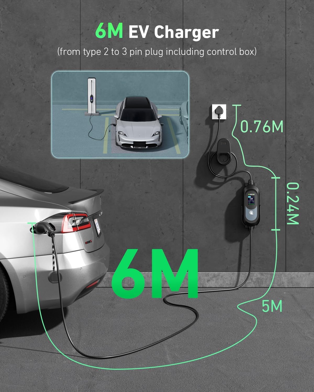 AFYEEV EV Charger - Type 2 to 3 Pin Commando Plug, Adjustable Current 8/10/13/16/32A, 6Meter, IP65 Rated, 7.2kW, Delay Timer 1-12 Hours, Carry Bag Included