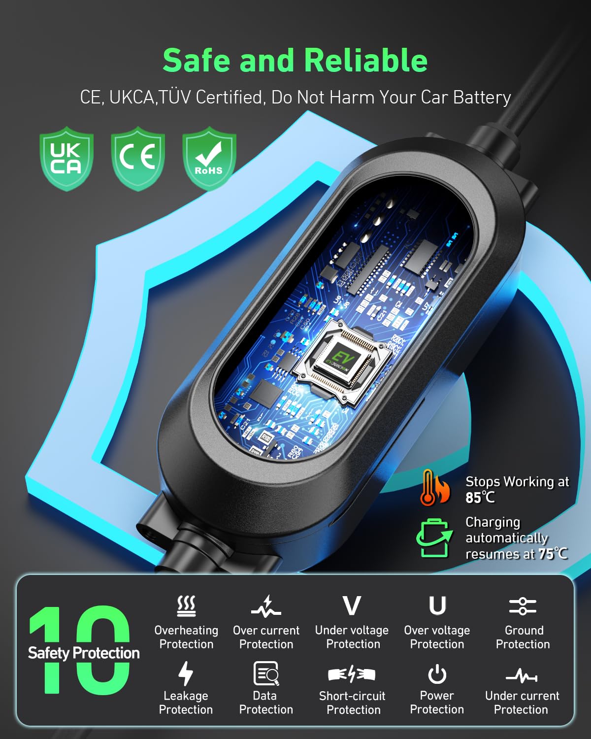Safety is a paramount concern for EV chargers, and this product does not disappoint. It meets UKCA, CE, and RoHS certifications, ensuring compliance with safety standards. The charger also boasts multi-layered protections against overheating and power surges, which is critical for protecting both the charger and the vehicle.