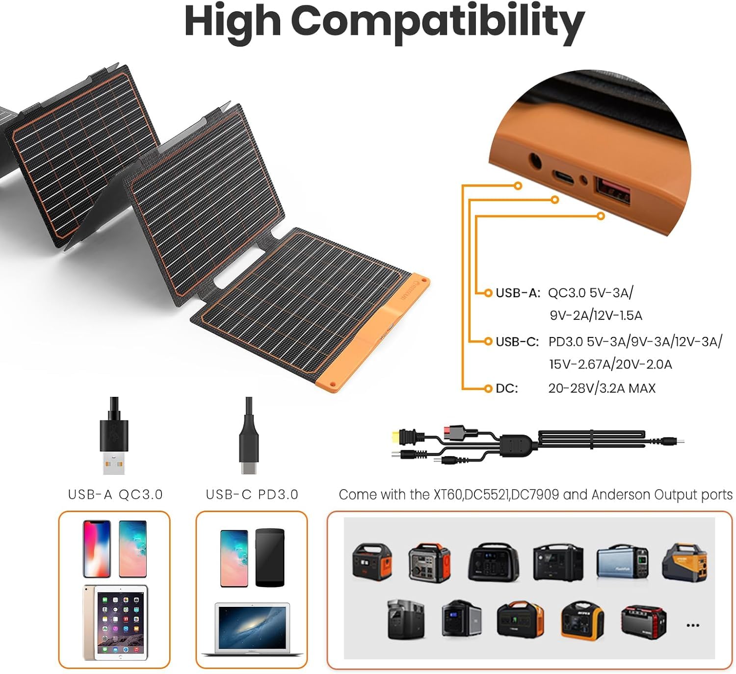 The FlexSolar 60W Solar Charger excels in several key areas. First, its ability to charge multiple devices simultaneously is a significant advantage. Equipped with a QC3.0 max 18W USB-A port, a PD3.0 max 40W USB-C port, and a maximum 60W DC output (20V-28V), it can effectively power everything from power banks and mobile phones to small power stations.