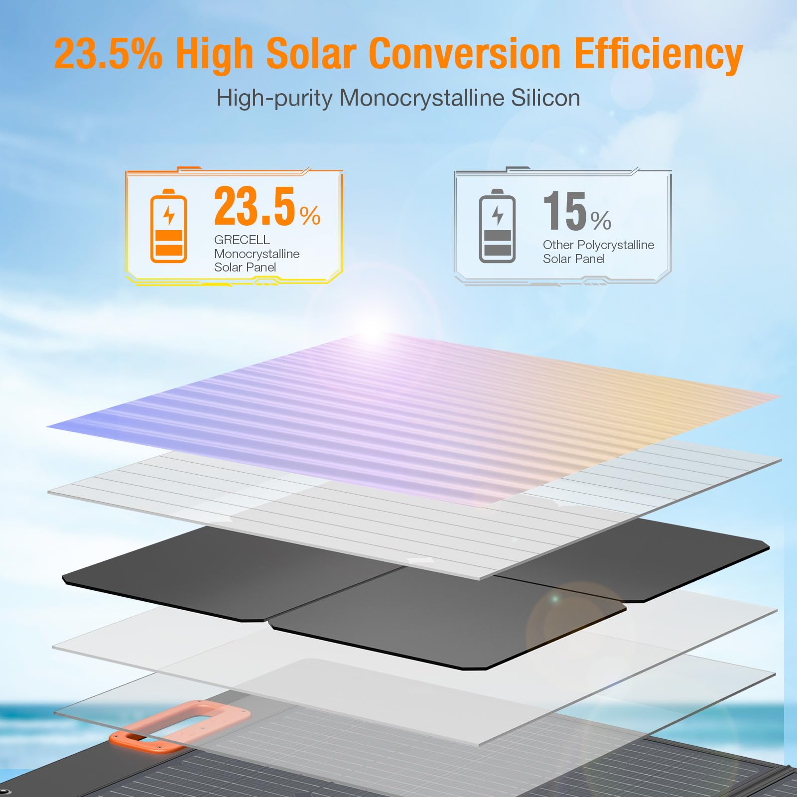The GRECELL solar panel has a high efficiency conversion rate of 23.5%, which is beneficial for generating more power from available sunlight.