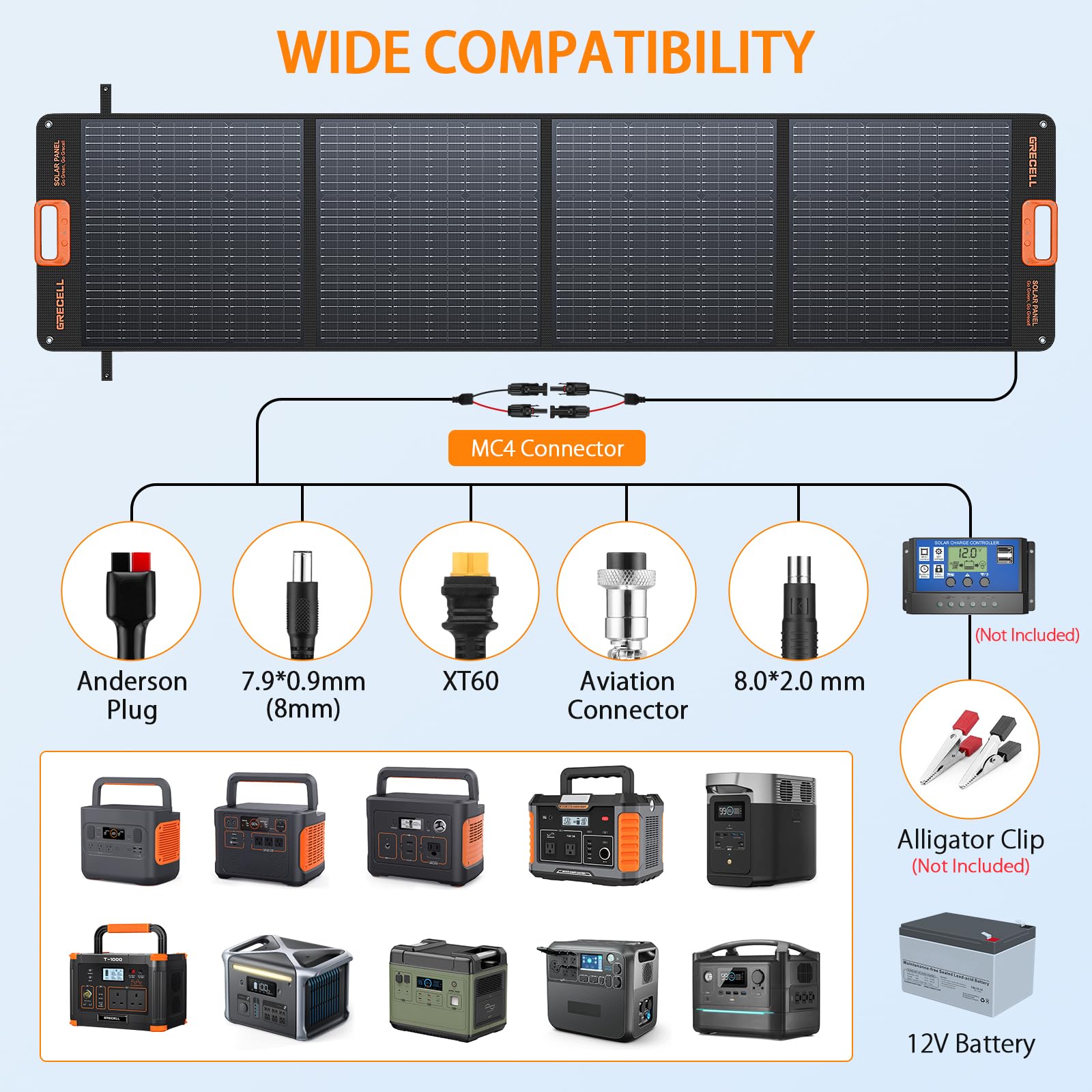 The GRECELL solar panel is compatible with 95% of power stations on the market due to its separate 4-in-1 cable. This feature allows for broader usability, whether you own a Jackery, DOKIO, or other popular brands, facilitating versatile charging options.