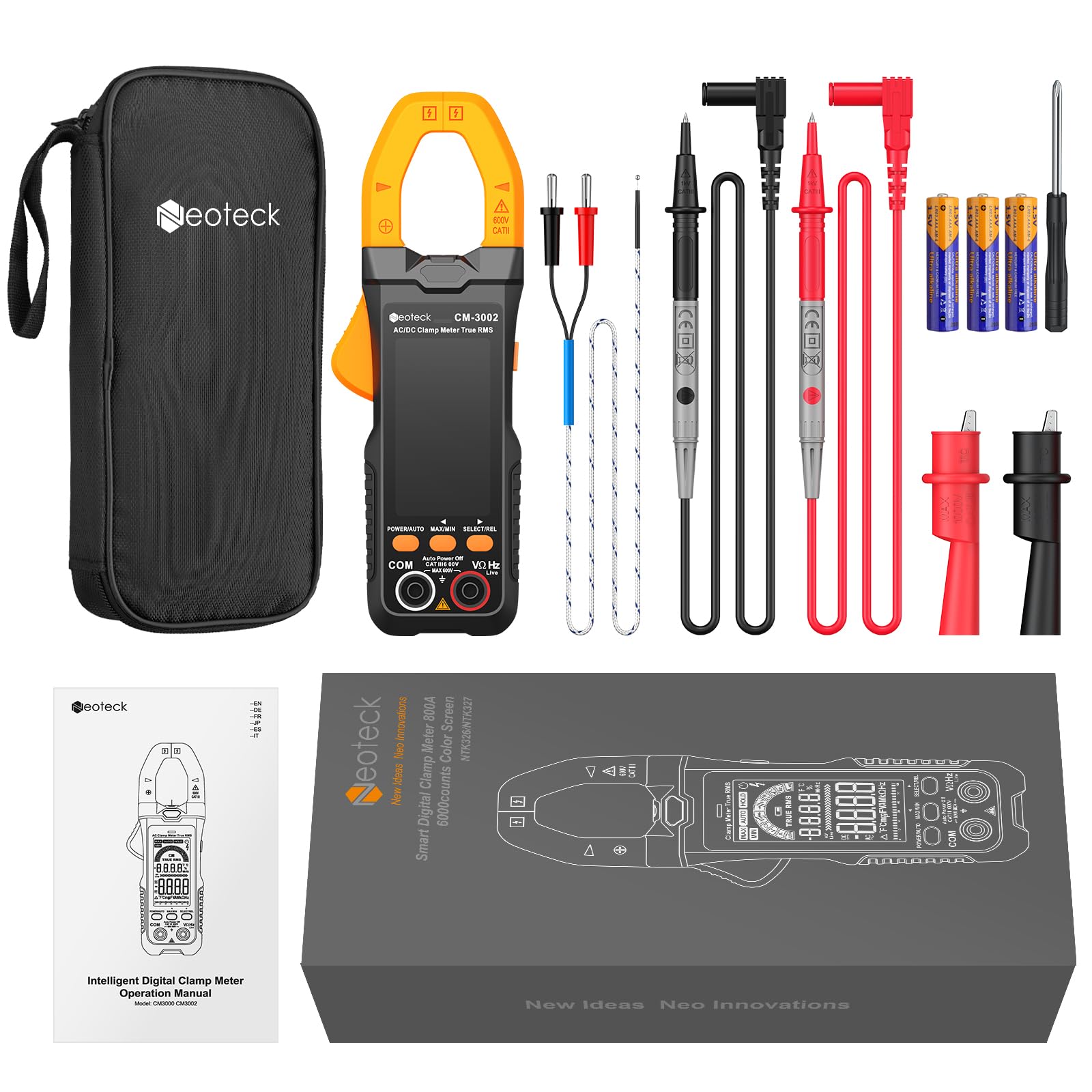 The Neoteck Smart Digital Clamp Meter is designed for durability and portability. It feels robust in hand, though it is lightweight enough for frequent use without fatigue. The included test leads and thermocouple are of decent quality, contributing to a complete kit that is ready for immediate use. However, some users have noted that the plastic casing could feel cheaper compared to higher-end models, which may affect long-term durability.