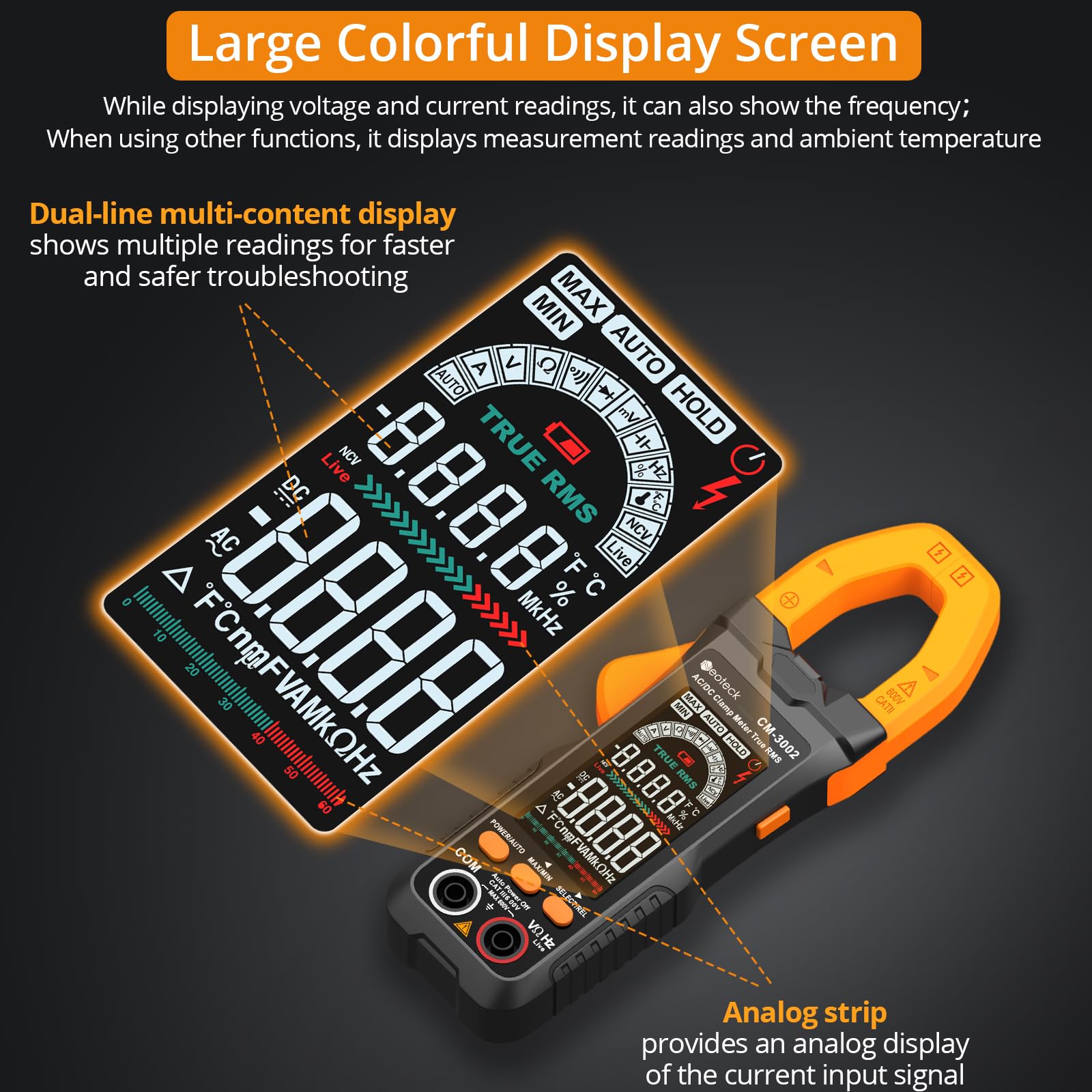 The device features a smart auto mode that automatically detects AC/DC voltage, continuity, and resistance upon startup. This function saves time, making it ideal for quick checks in various settings, from home wiring to automotive diagnostics. The large HD colour display is another significant advantage, providing clear readings and a live bar graph that enhances interpretability, especially in bright conditions.