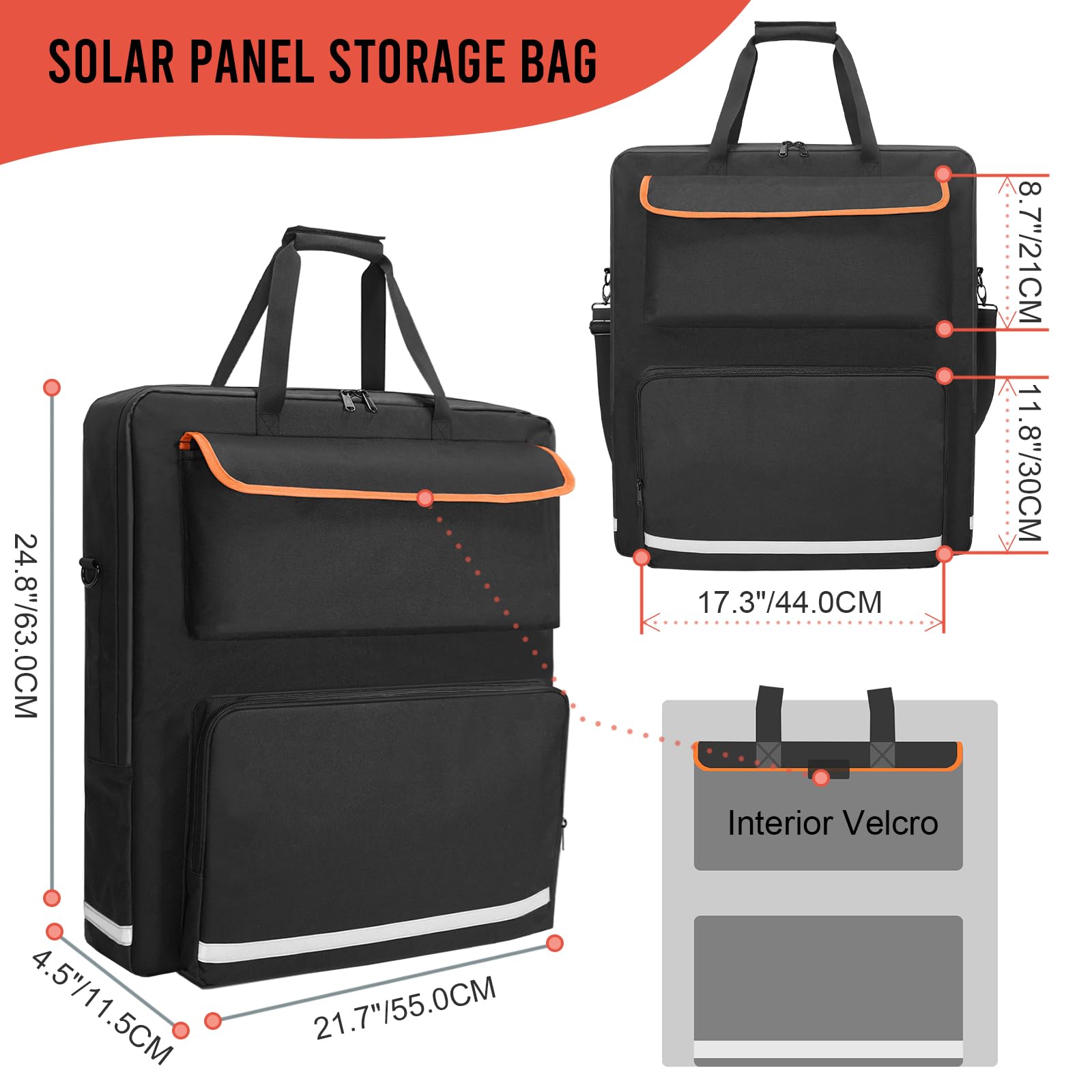 The bag measures 22 x 4.5 x 25 inches, accommodating most 60W and 100W foldable solar panels.