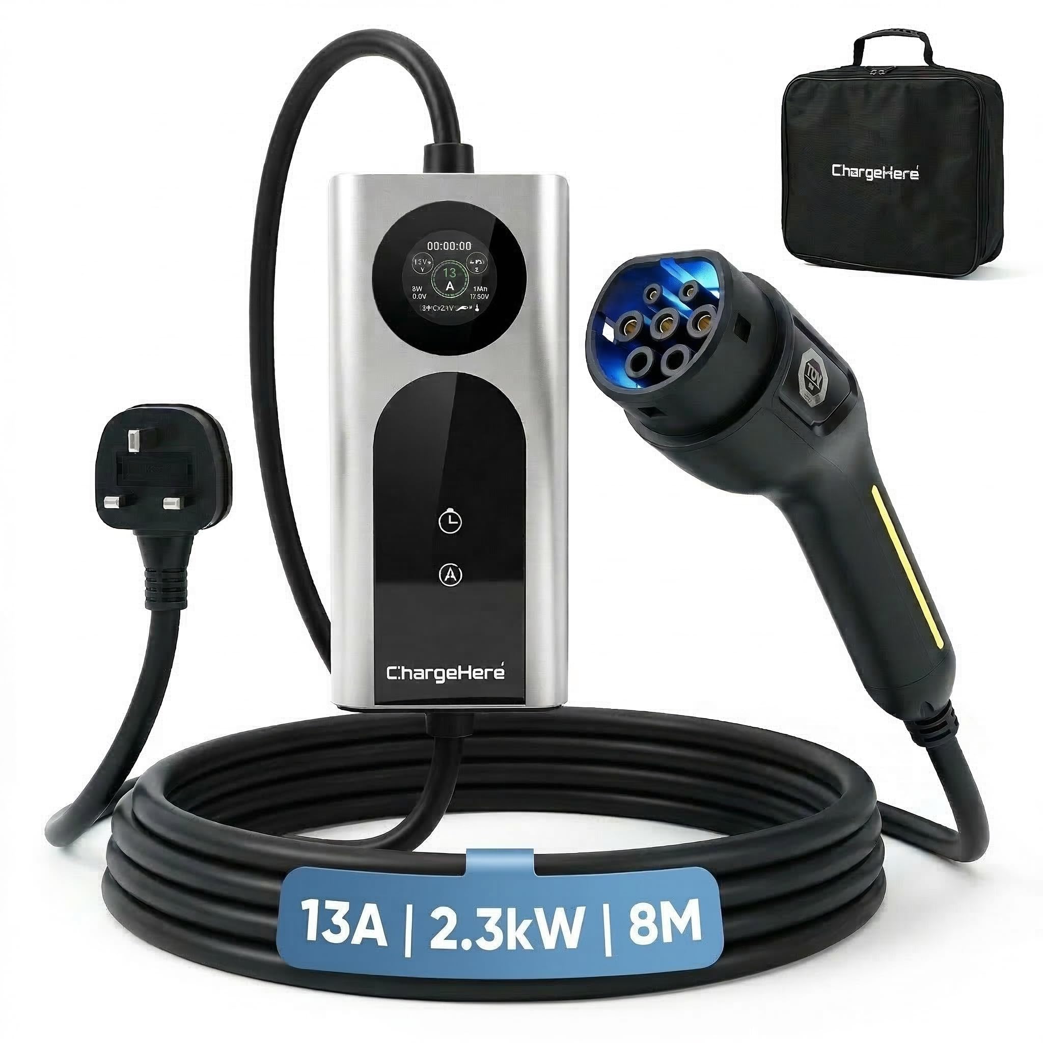 ChargeHere Portable EV Charger Type 2 to UK 3-Pin Plug, 3kW 13A Electric Vehicle Charging, Adjustable Current with Smart LCD Display & Delay Start, IP67 Waterproof, Compatible with Most car (8M)