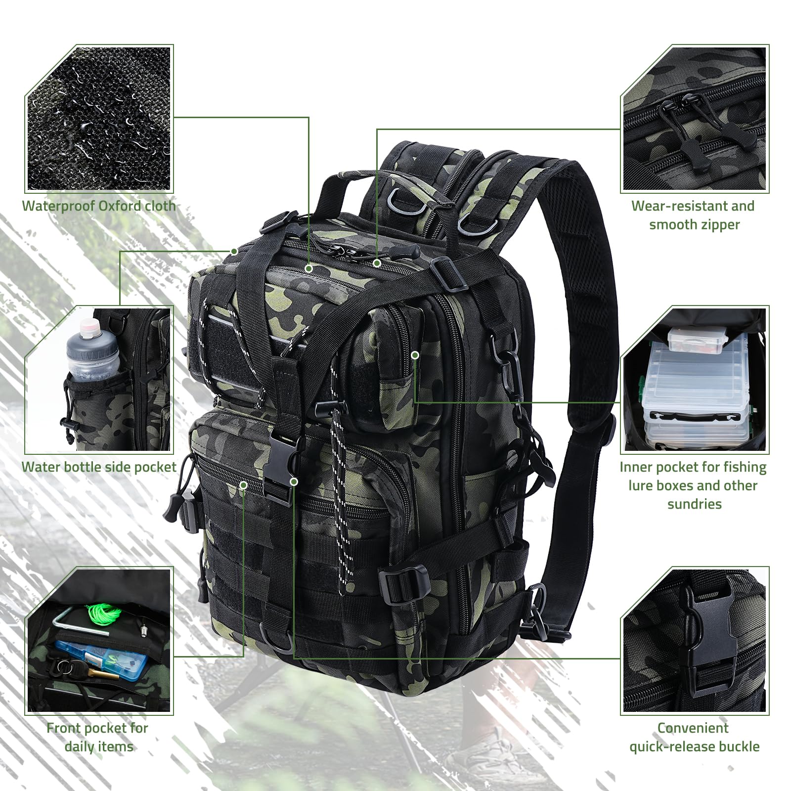 - Oxford cloth construction with extra strong stitching is a sensible budget-material choice for fishing and outdoor use.