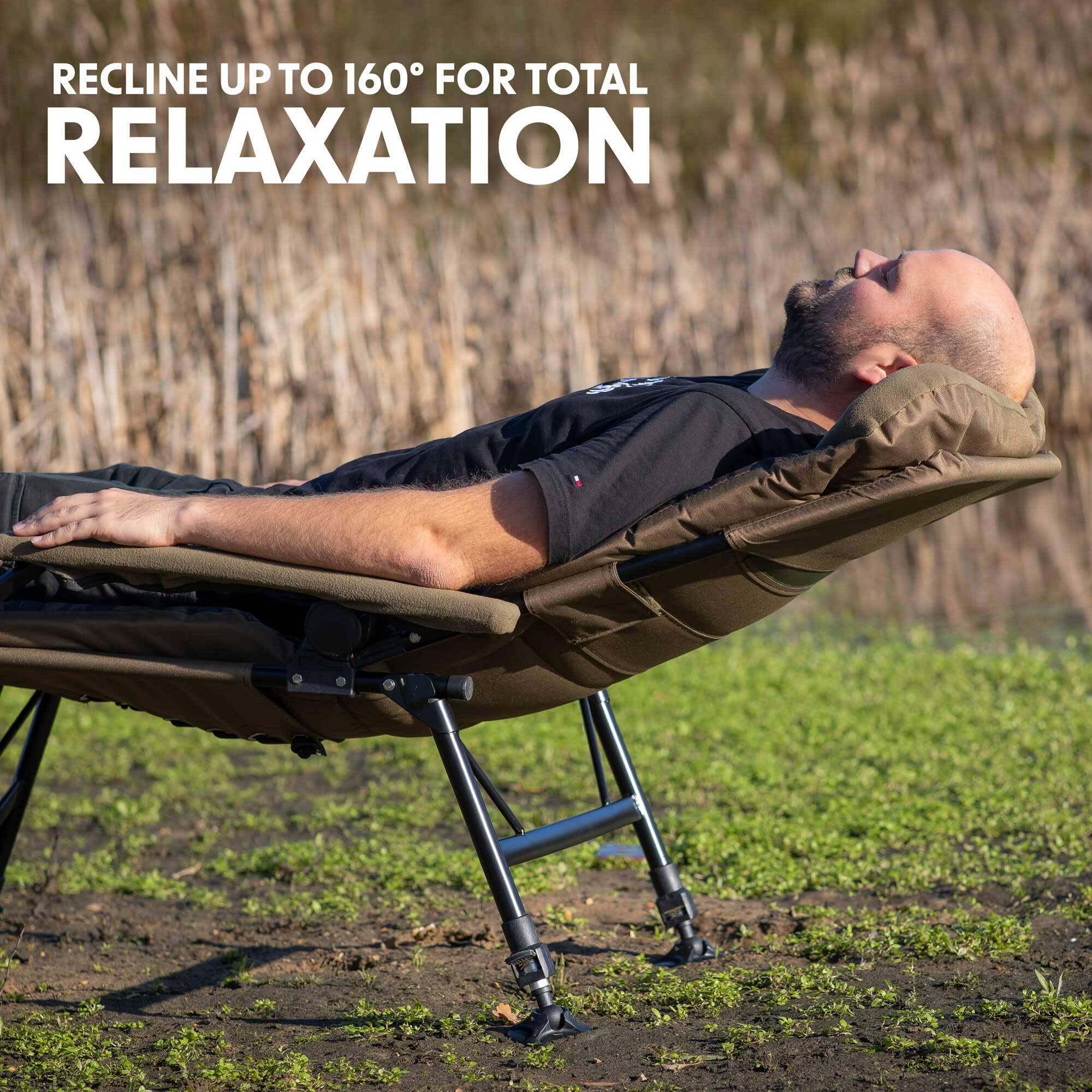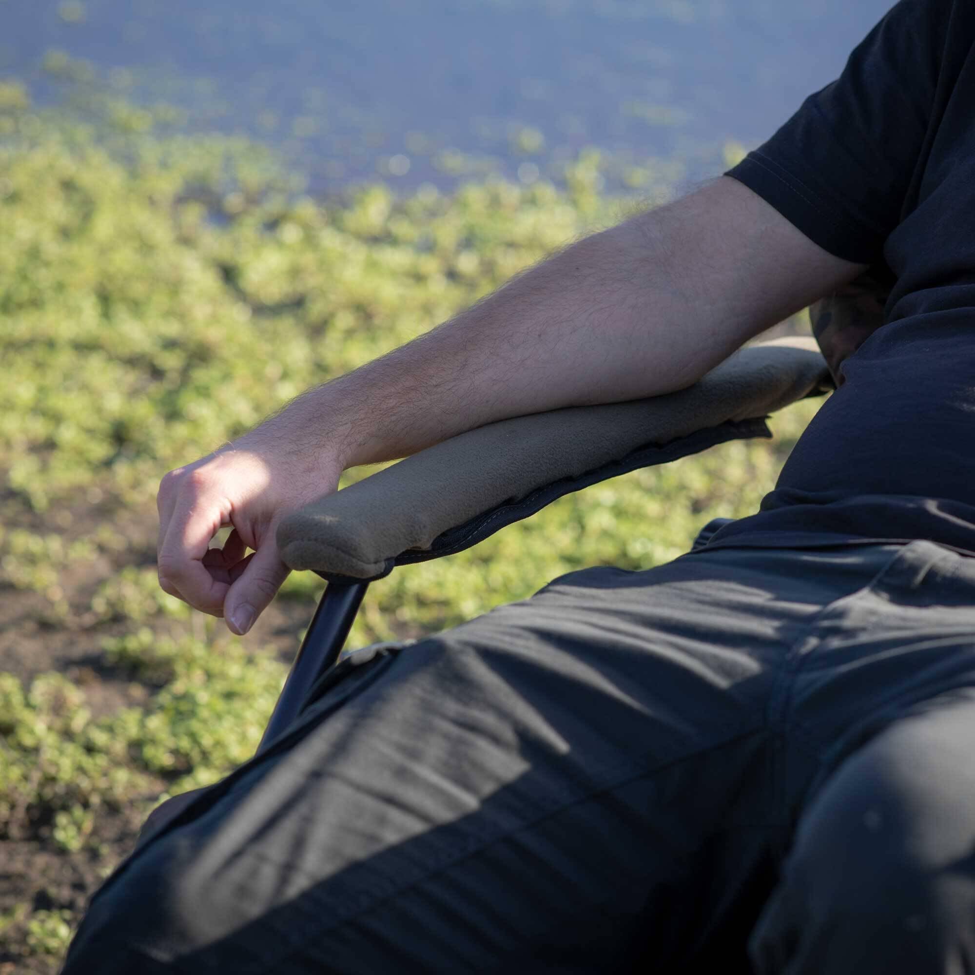 The Dellonda chair features a fully adjustable backrest that reclines between 90° to 160°, allowing anglers to find their preferred sitting position. This is particularly beneficial for those long waits while carp fishing on still waters or while relaxing at a campsite after a day of fishing. The large padded backrest (560mm wide by 750mm high) is designed for adults, ensuring ample support.