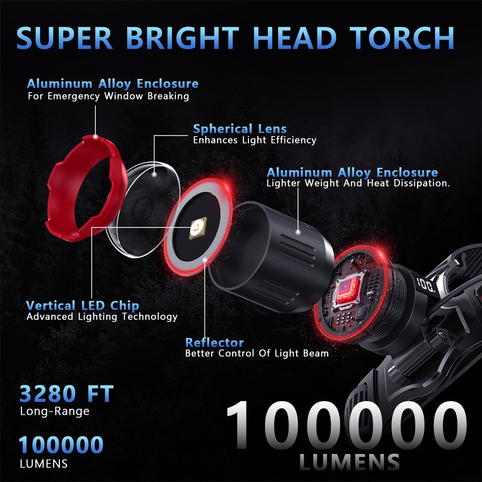 That said, there is a warning here. The listing is very ambitious, and the 100,000-lumen claim is the sort of figure that should be treated cautiously unless independently measured. Also, while the torch is described as waterproof, no formal waterproof rating is provided in the data, so I would not assume it is suitable for prolonged submersion or heavy abuse in the same way as a fully rated work light.
