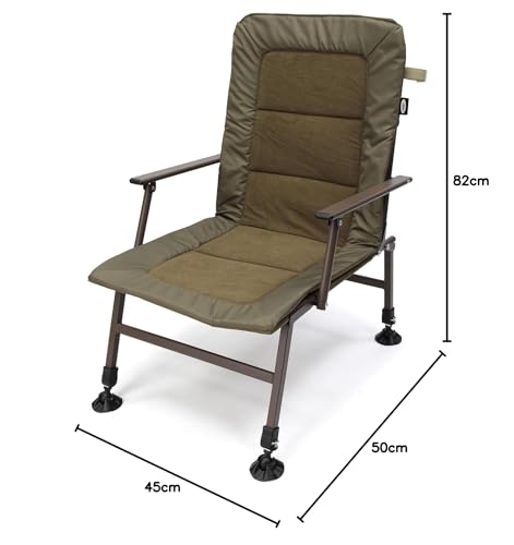 - Two-tone padded seat and armrests improve comfort for longer carp and coarse sessions.