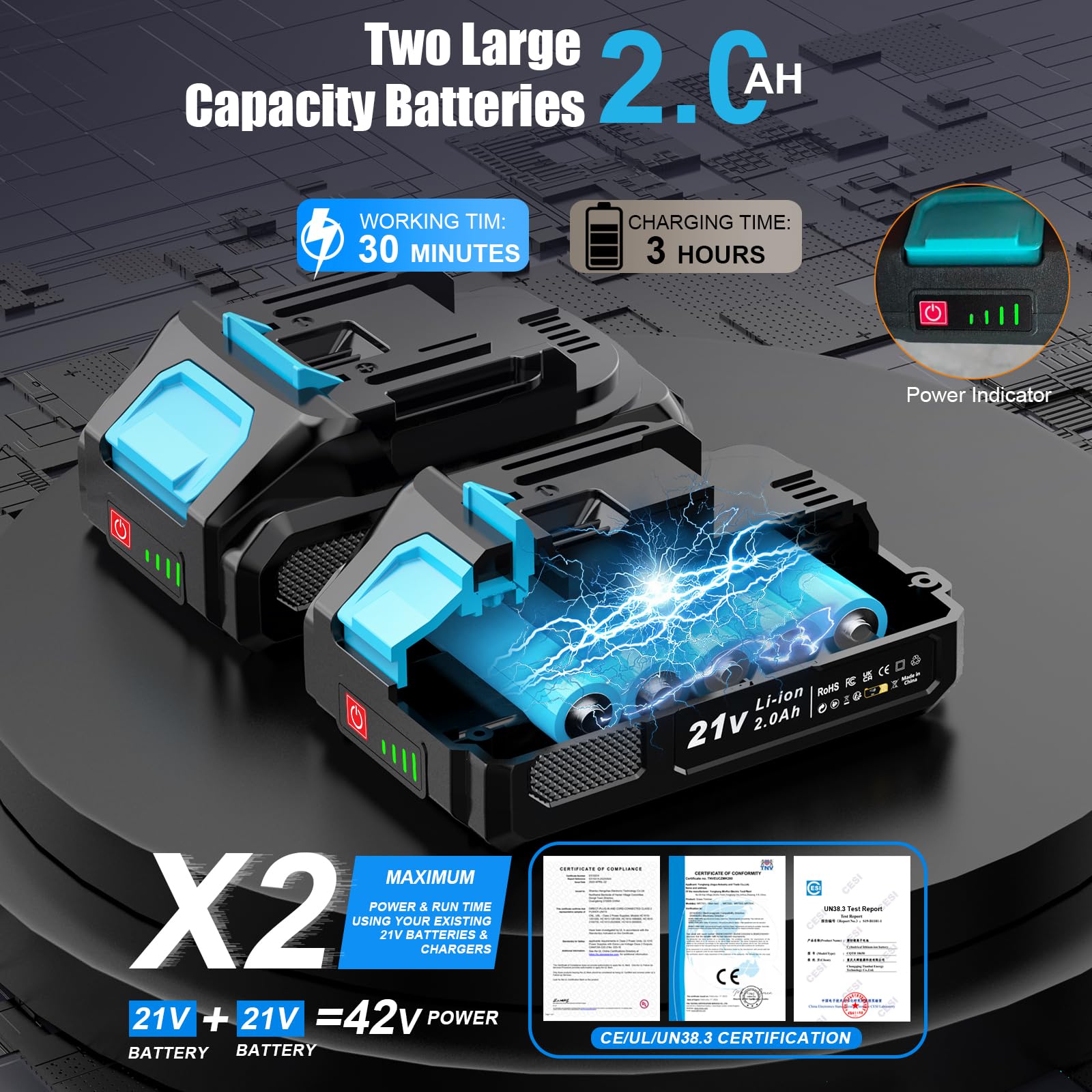The listing says the two 2000mAh batteries provide about 30 minutes of use, which is enough for routine trimming in a small garden or for edging and touch-up work. If your lawn is larger, or if you have thick weeds and lots of borders, you will probably need to work in shorter sessions or recharge between tasks.