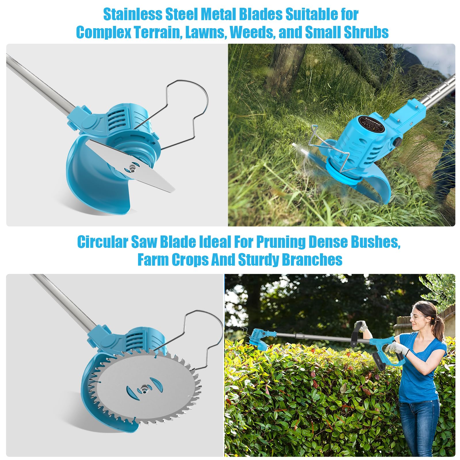 For this price, KUZUPRO actually gives you more than most budget strimmers: a 21V cordless setup, a 400W motor, 11,000 rpm speed, two 2.0Ah lithium batteries, and two types of metal blades instead of those flimsy plastic ones.