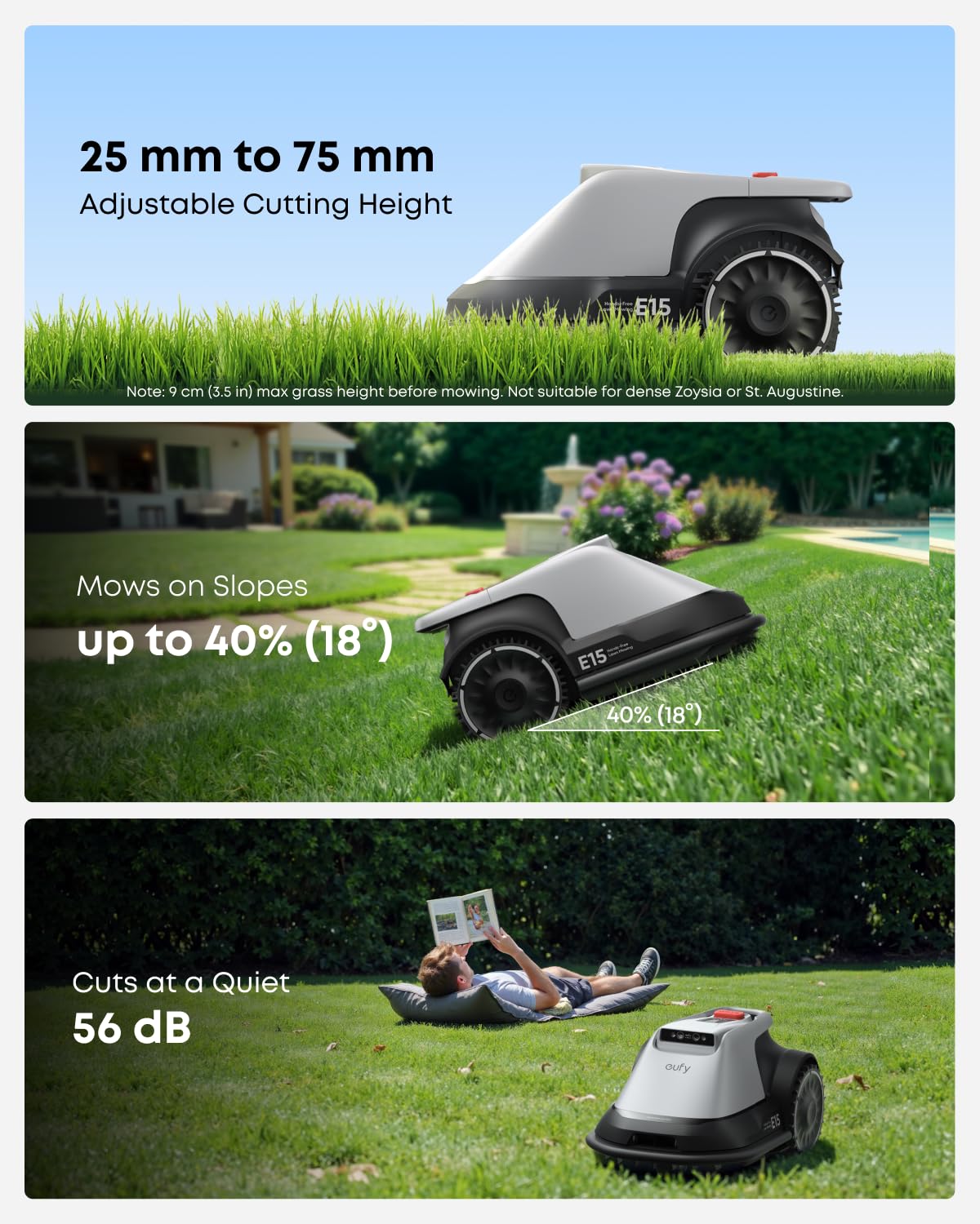 The eufy E15 is designed to efficiently mow common UK grass types such as fescue and ryegrass, providing a clean cut.