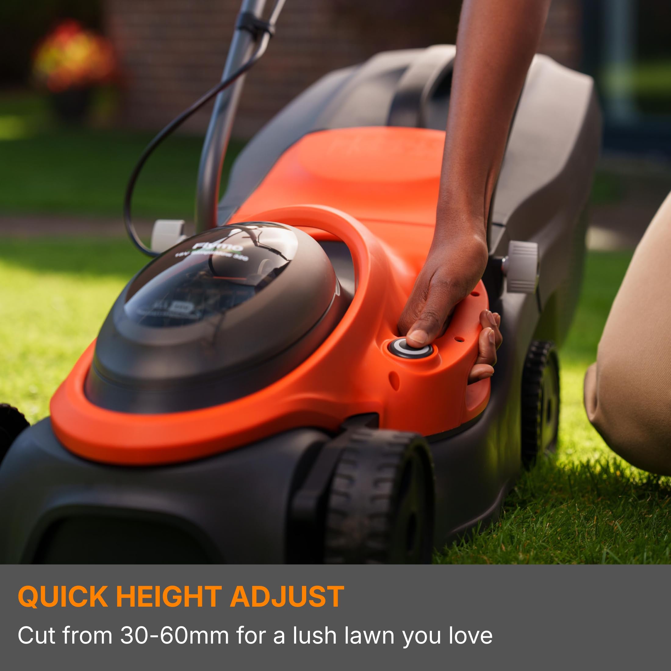 - One-hand height adjustment allows for quick changes between cutting heights.