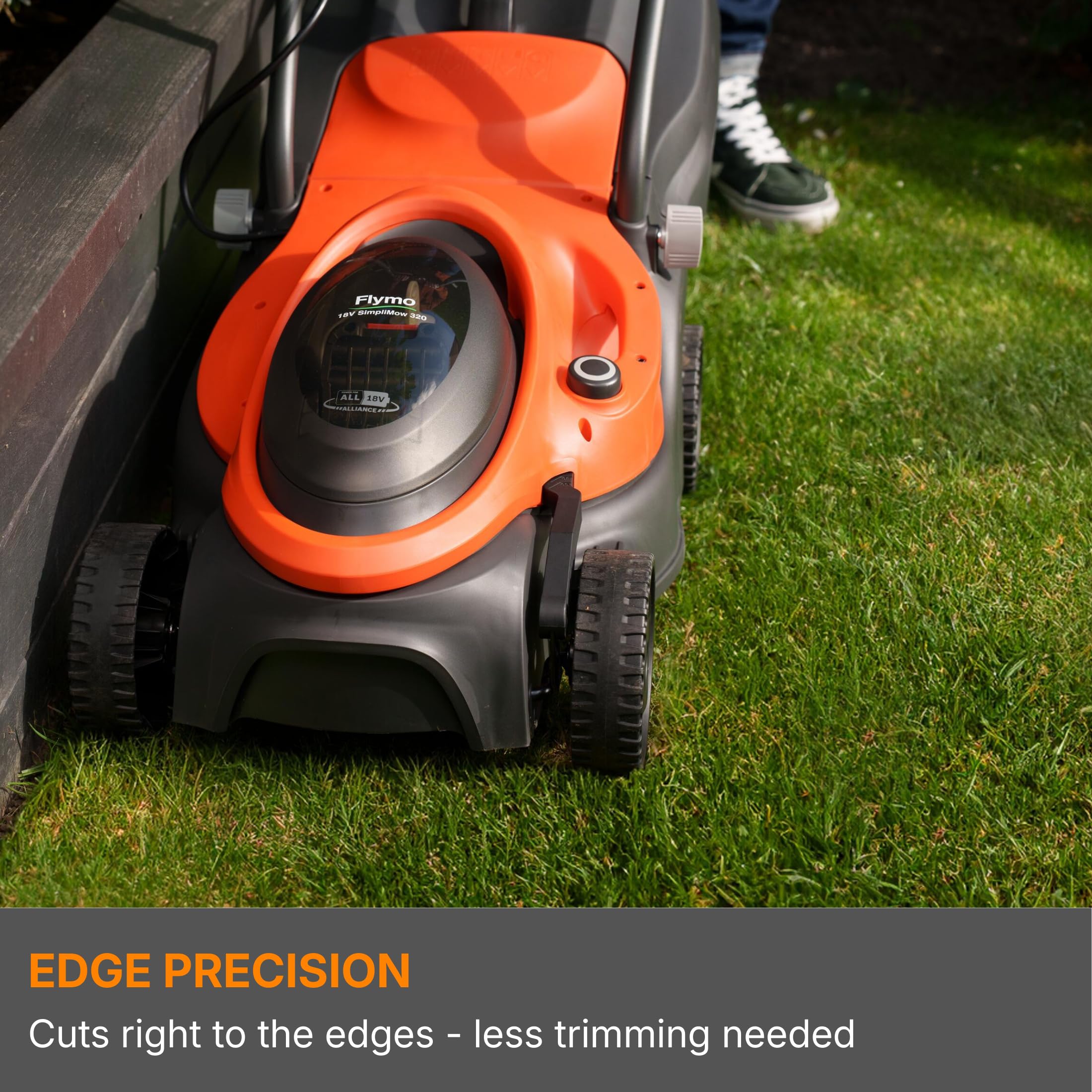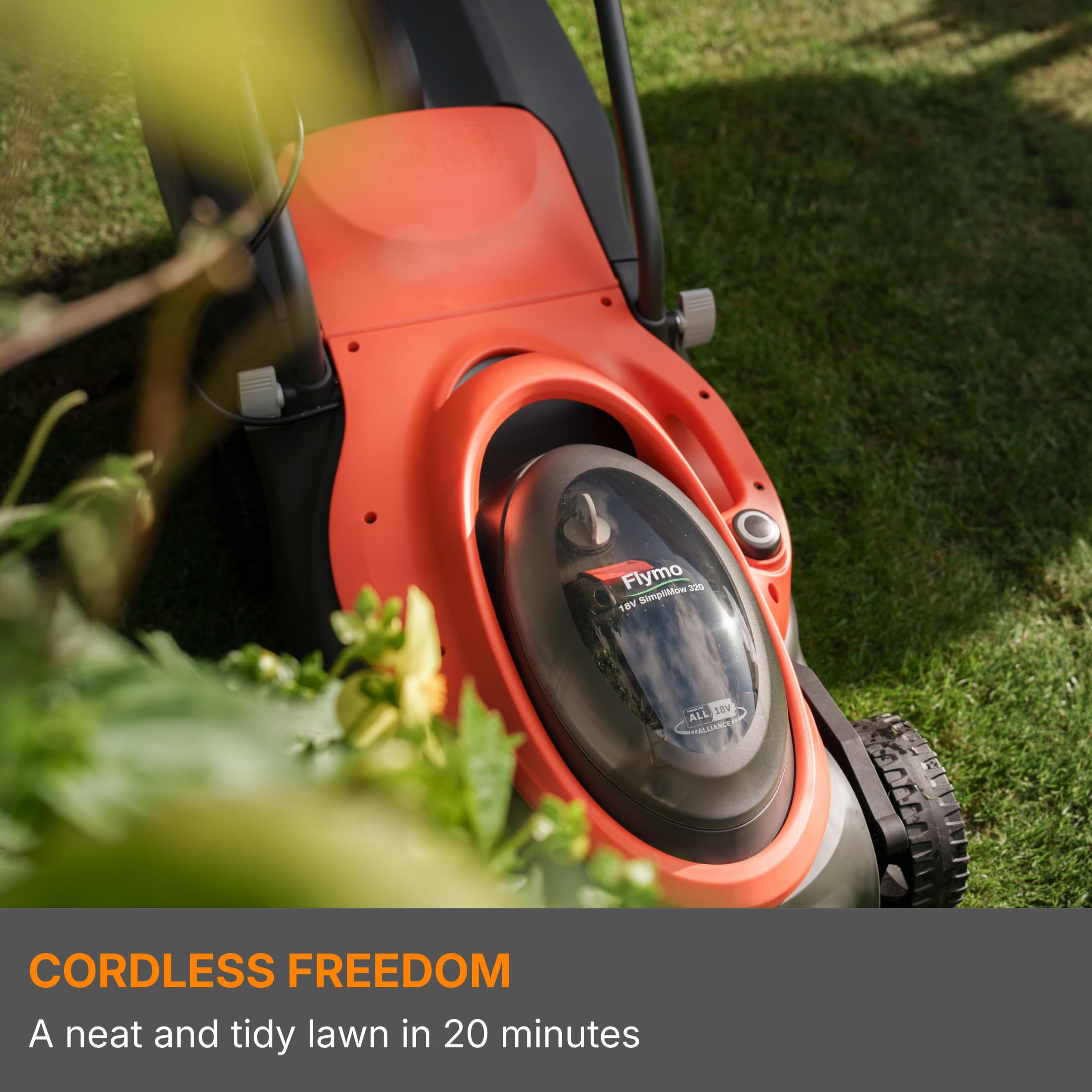 The Flymo SimpliMow 320 features a cutting width of 32cm, suitable for lawns up to 200m².