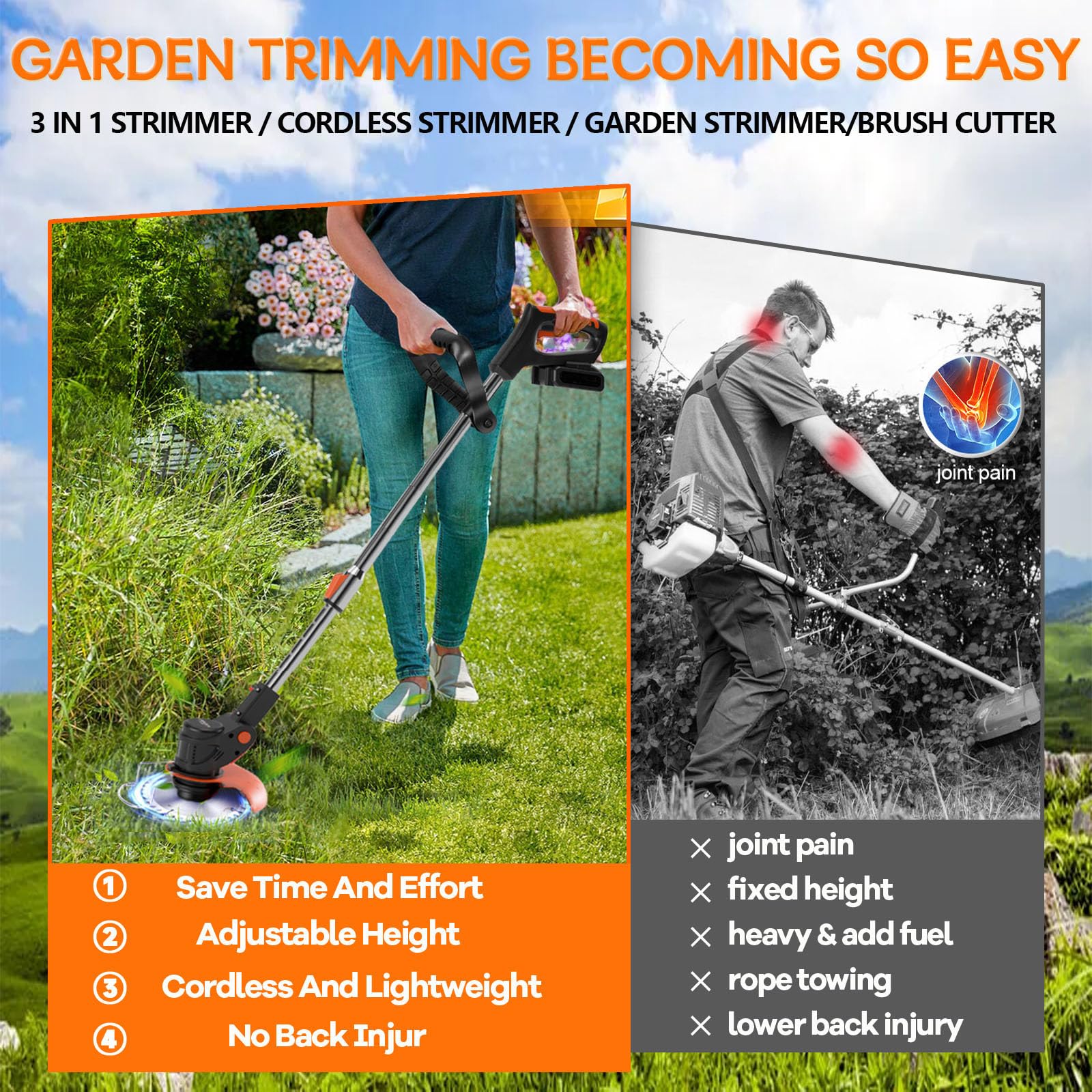 The design really focuses on small and medium gardens, cordless operation, and a brush-cutter style setup.