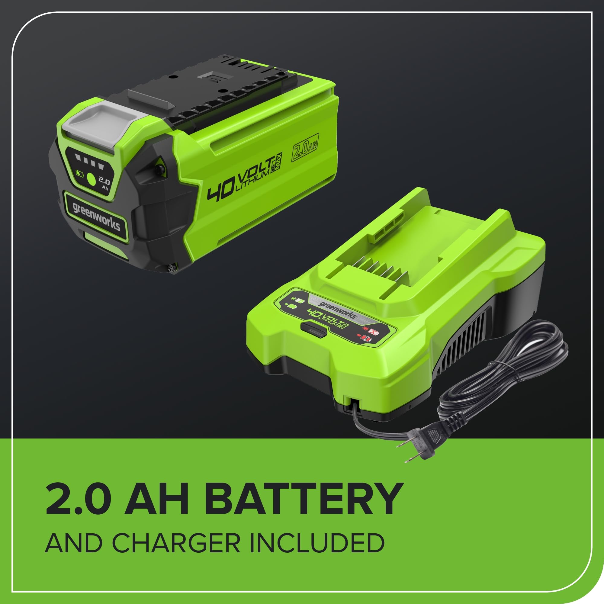- Includes a powerful 40V 2Ah lithium battery, compatible with other Greenworks tools.
